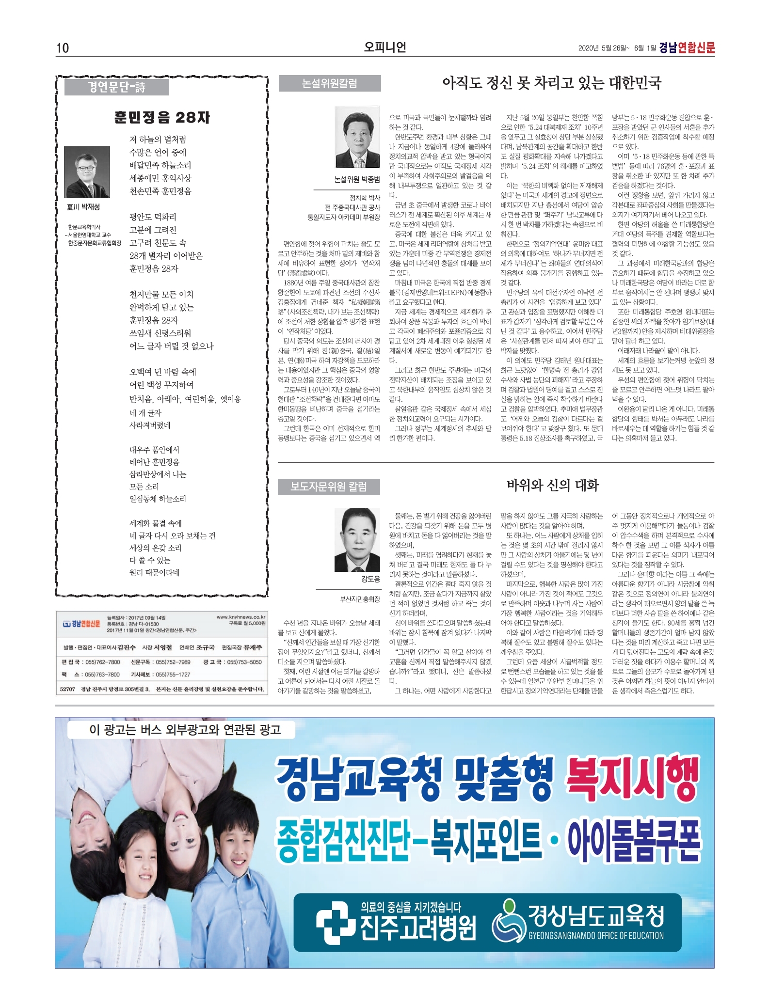 경남연합신문에 박재성 이사장 시 <훈민정음 28자> 수록