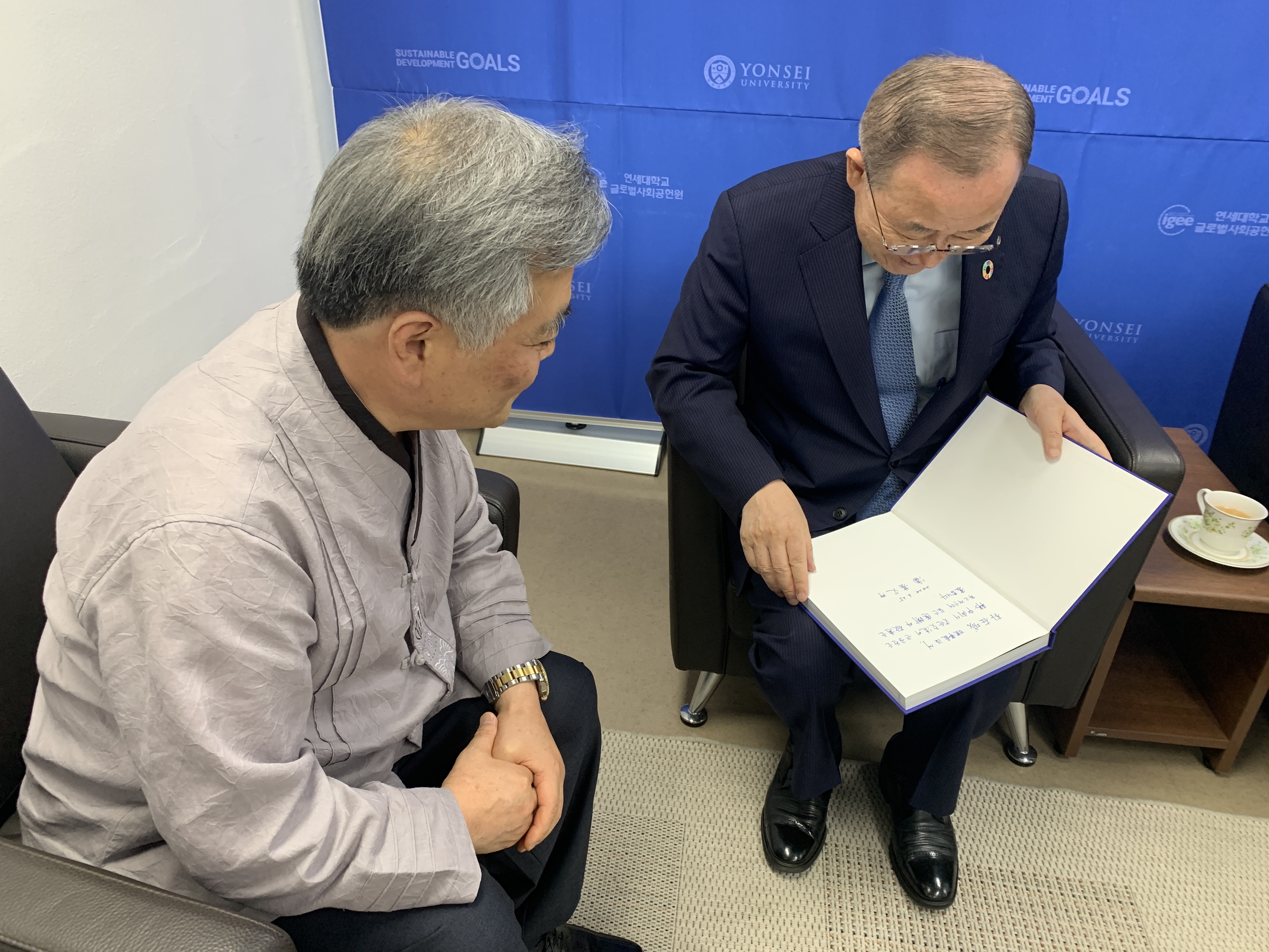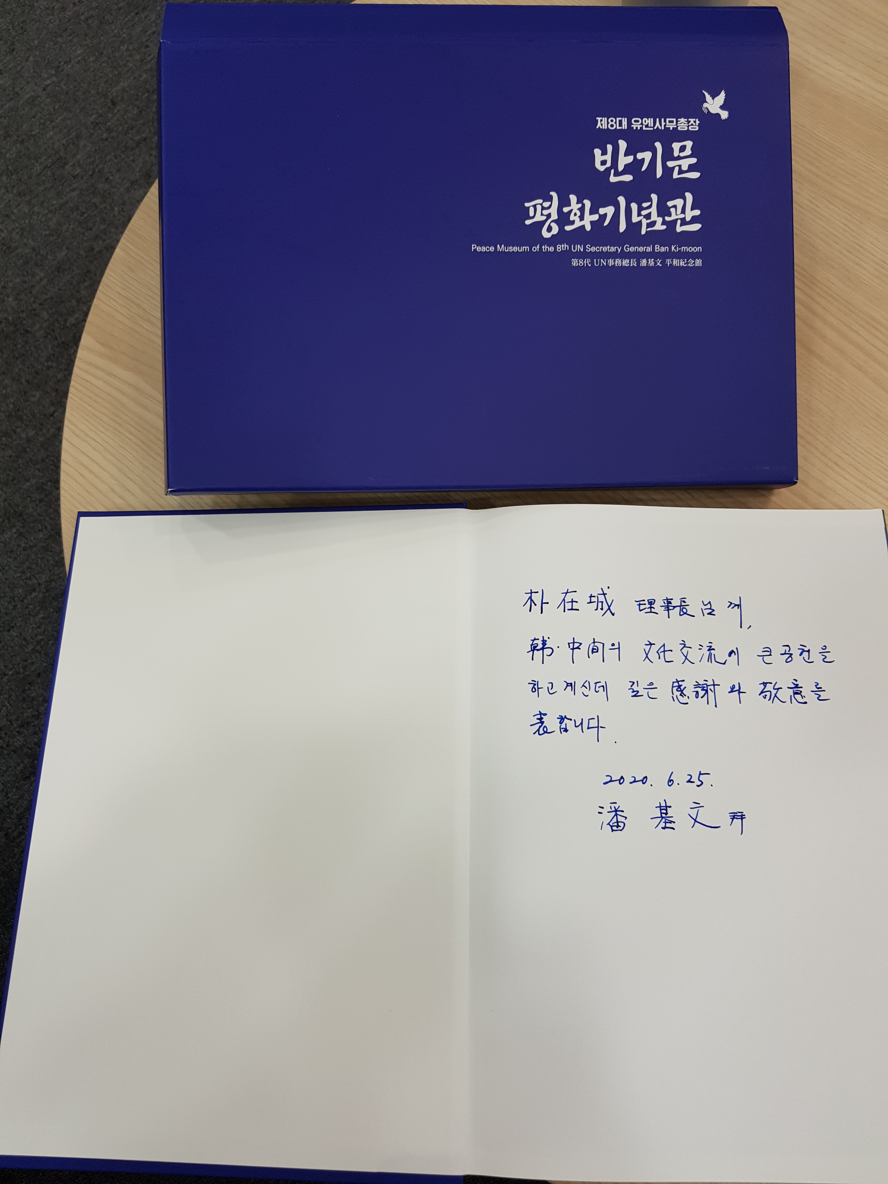 2020년 6월 25일(목) 오후 3시에 반기문 전 UN사무총장님의 초대를 받고 약 1시간 가량 훈민정음탑 건립의 필요성에 대해서 환담한 후 <제8대 유엔사무총장 반기문 평화기념관> 도록에 직접 서명하시어 본 회 박재성 이사장에게 선물을 주시는 반기문 전 UN사무총장님
