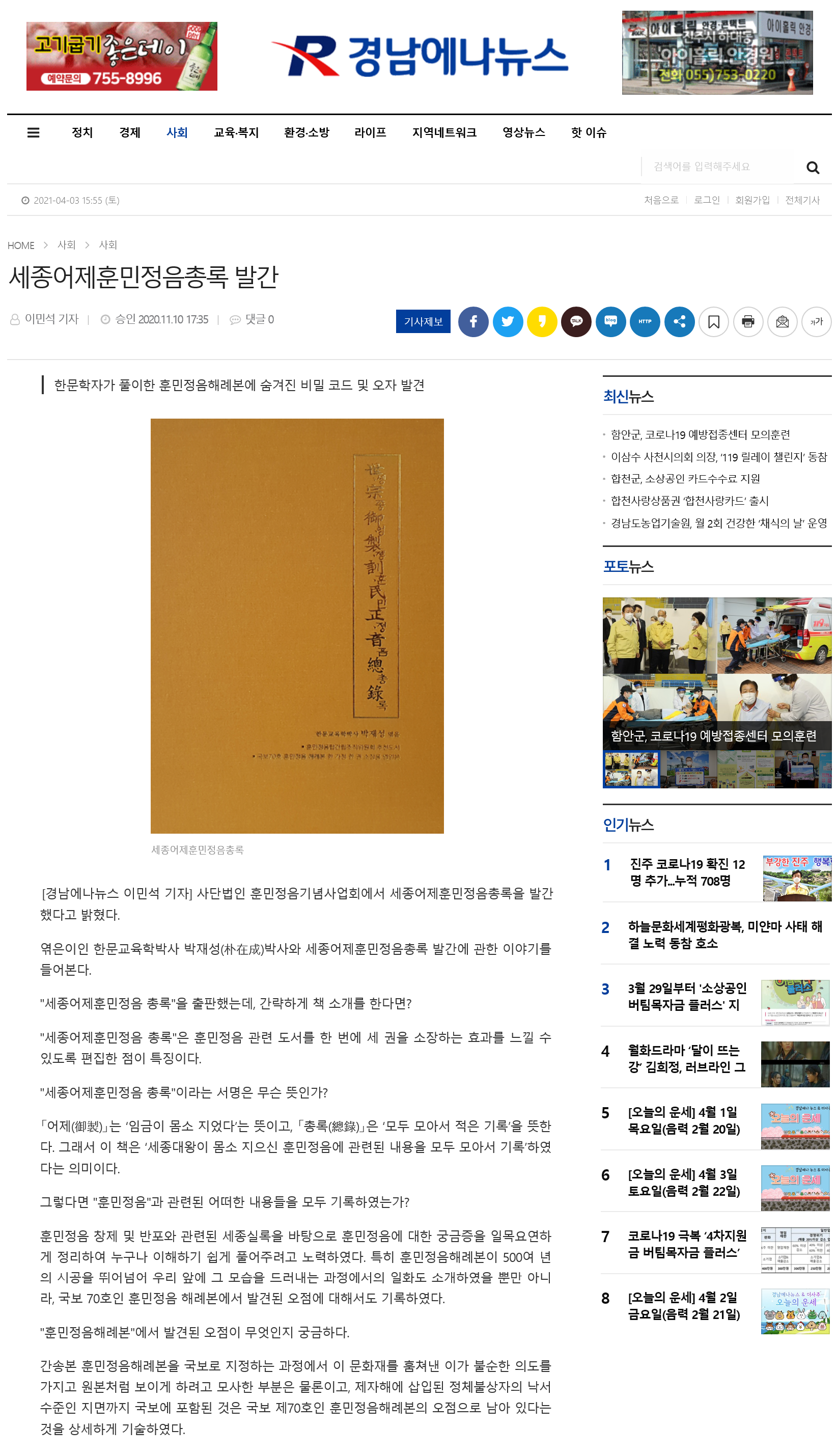 [경남에나뉴스 이민석 기자] 사단법인 훈민정음기념사업회에서 세종어제훈민정음총록을 발간했다고 밝혔다.