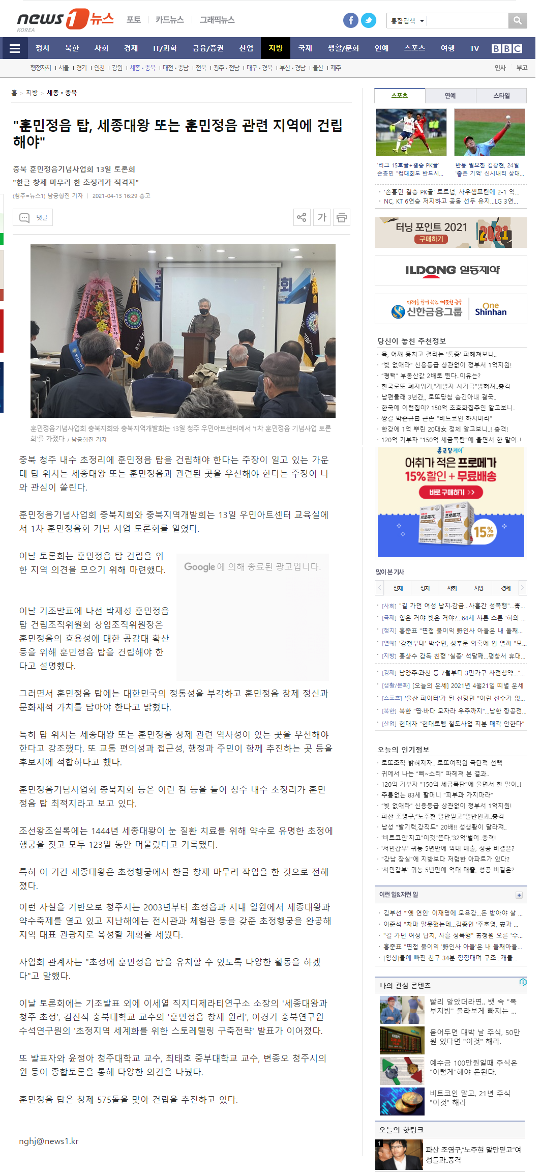"훈민정음 탑, 세종대왕 또는 훈민정음 관련 지역에 건립해야" (news1.kr)