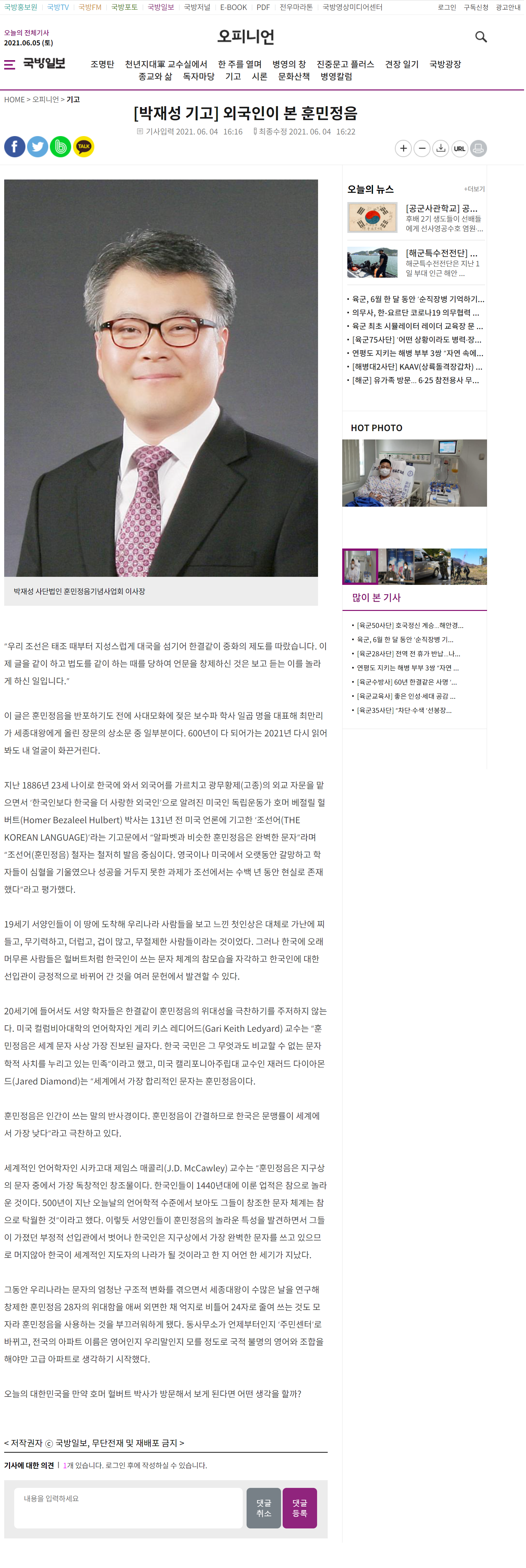 국방일보 오피니언 - 외국인이 본 훈민정음(2021.6.5)