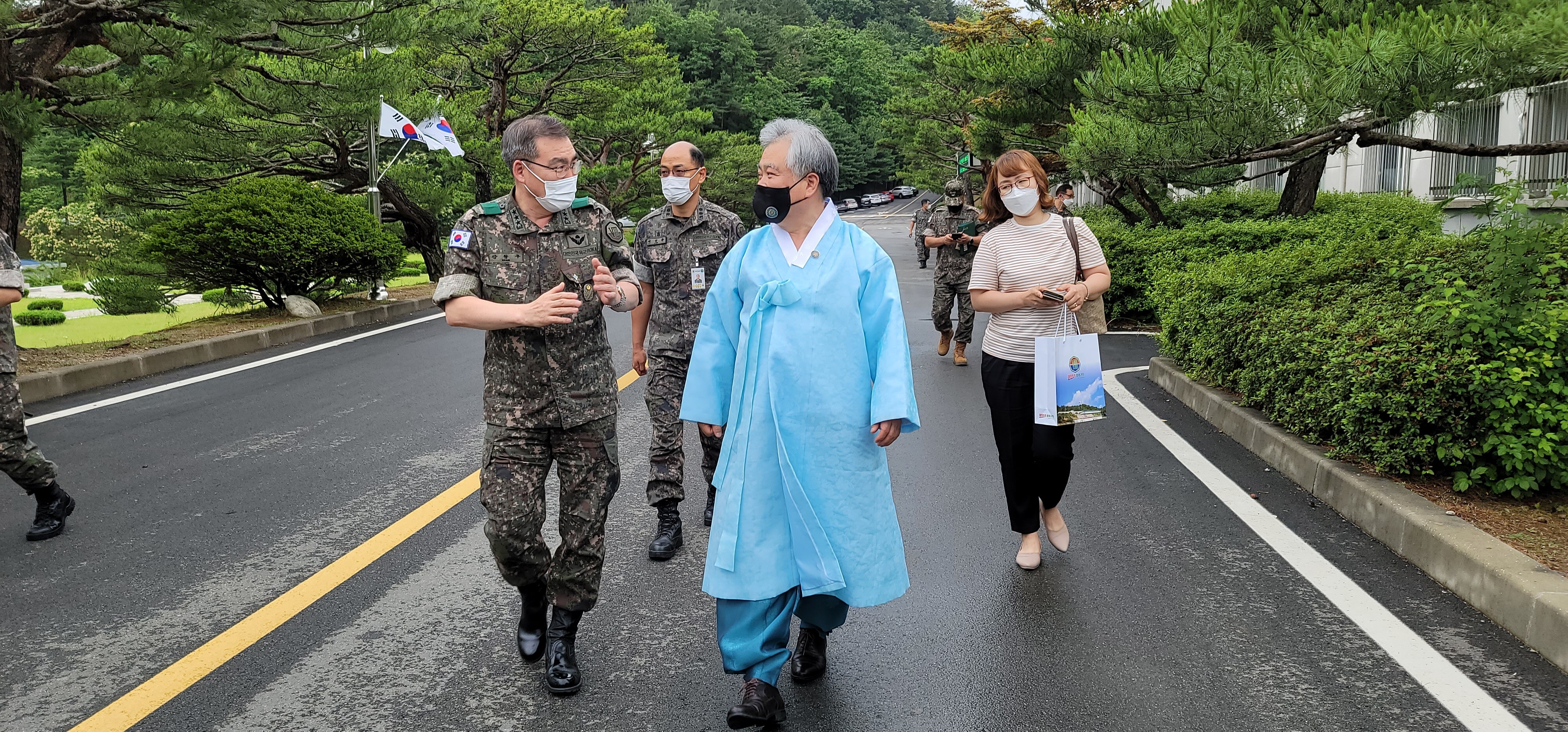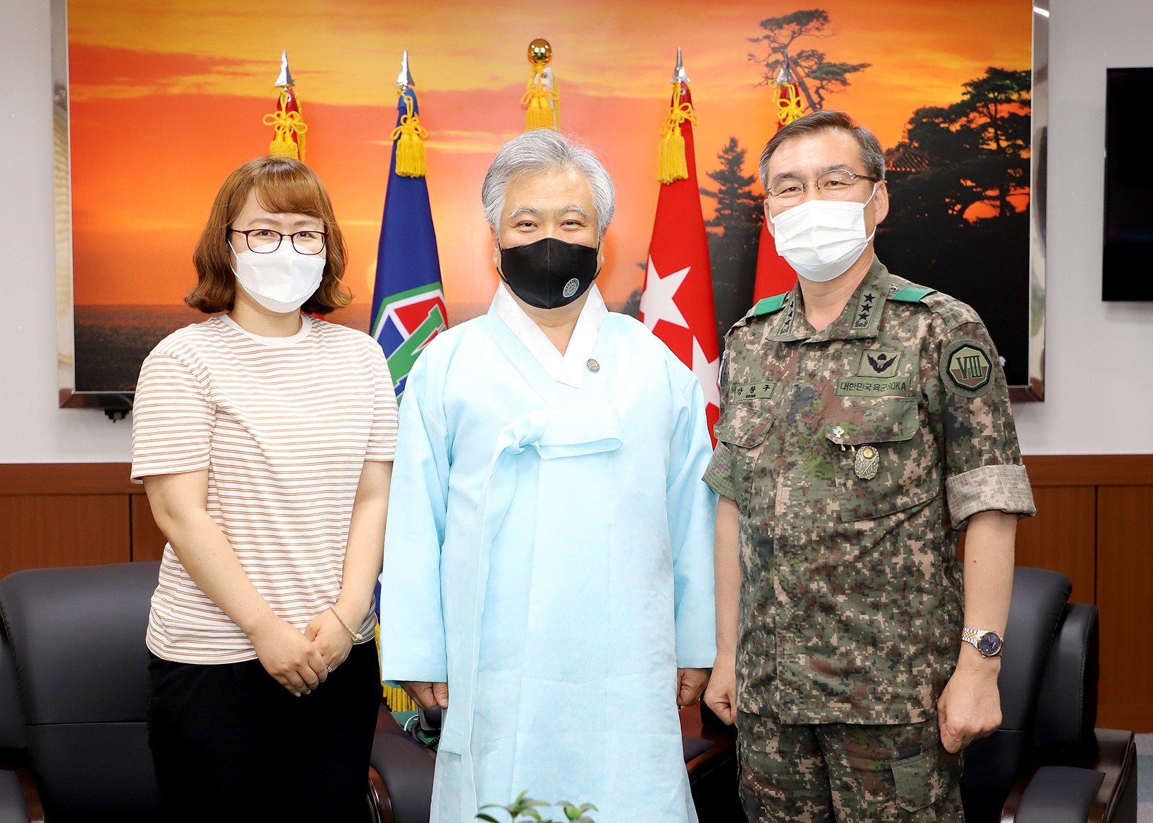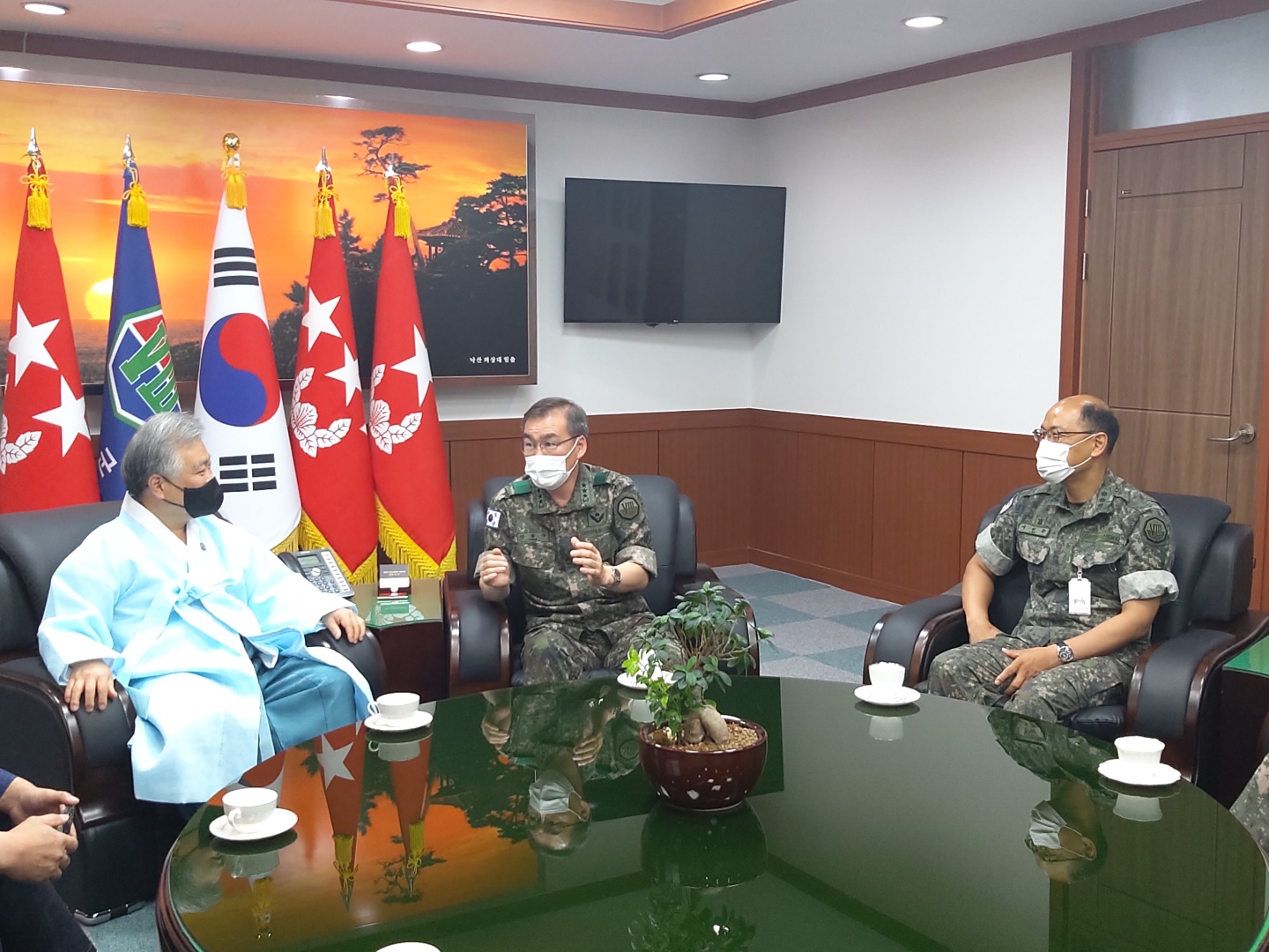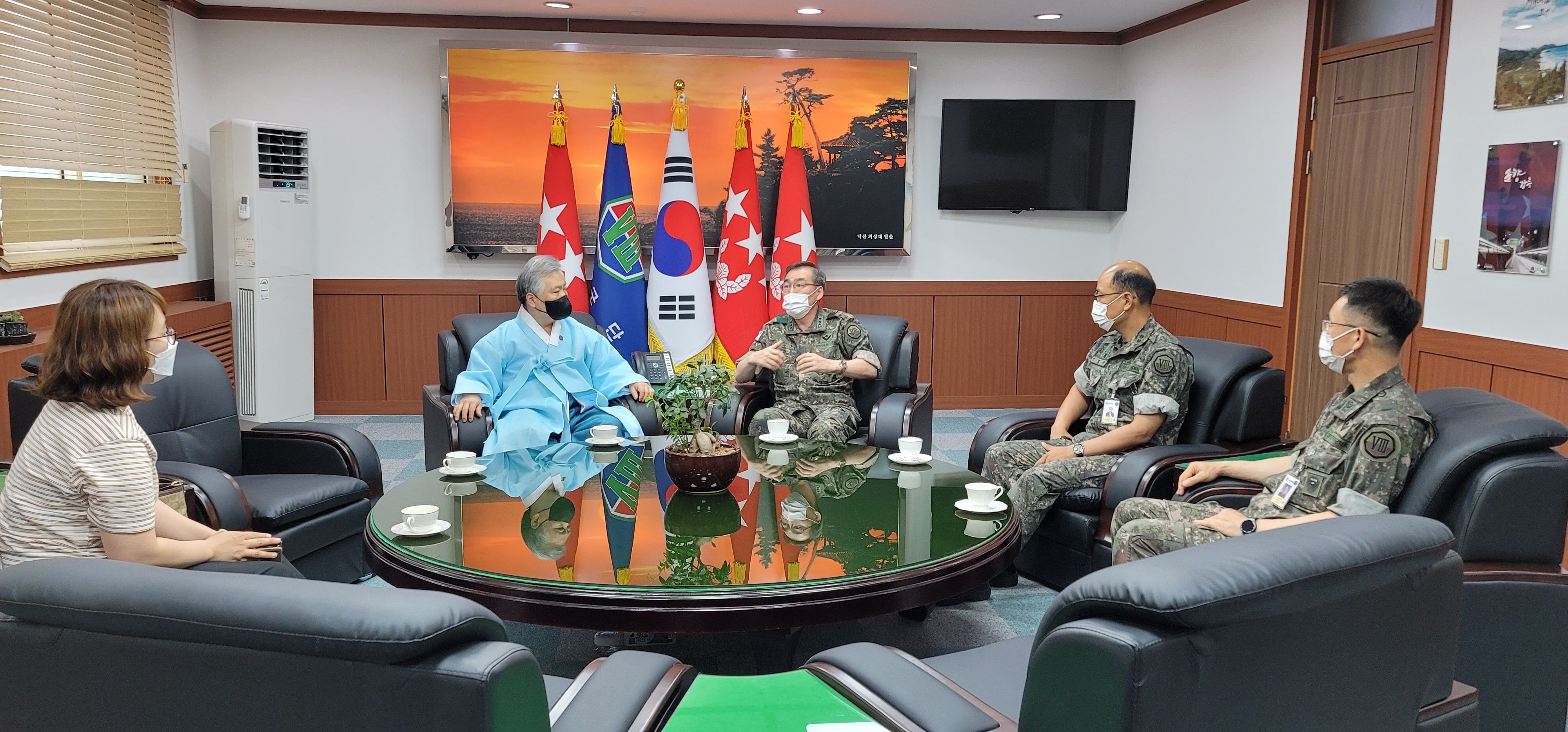2021년 6월 16일(수) 사단법인 훈민정음기념사업회 박재성 이사장은 위풍당당 충용군단 제8군단장 강창구 중장의 초청을 받고 군단장실에서 환담을 나누었다. 이 자리에는 제8군단 공보정훈참모 이성준 대령, 조용현 주임원사와 박화연 훈정회 사무처장, 김용태 훈탑위 부총재가 배석하였다.