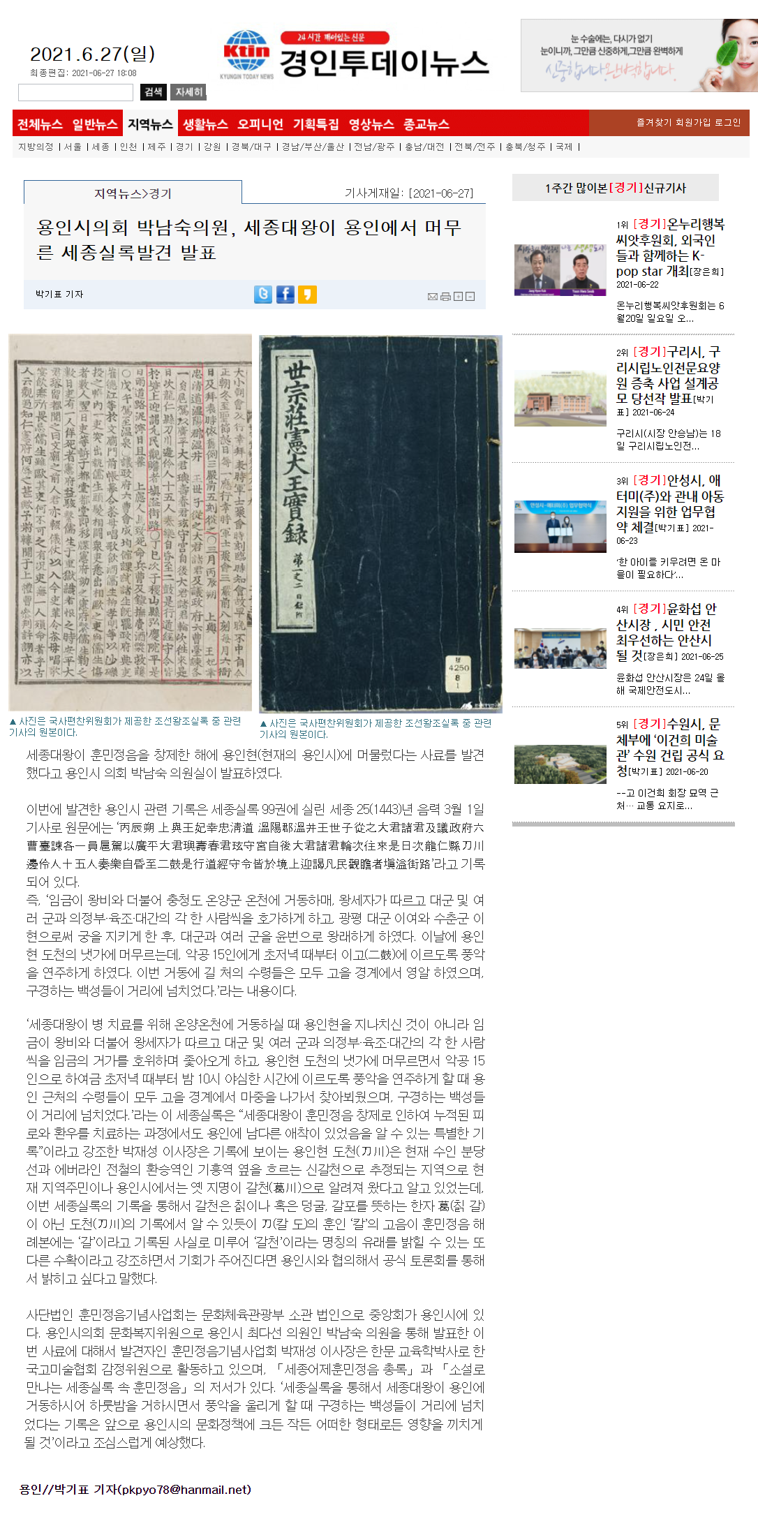 [경인투데이뉴스] 세종대왕이 용인에서 머무른 세종실록발견