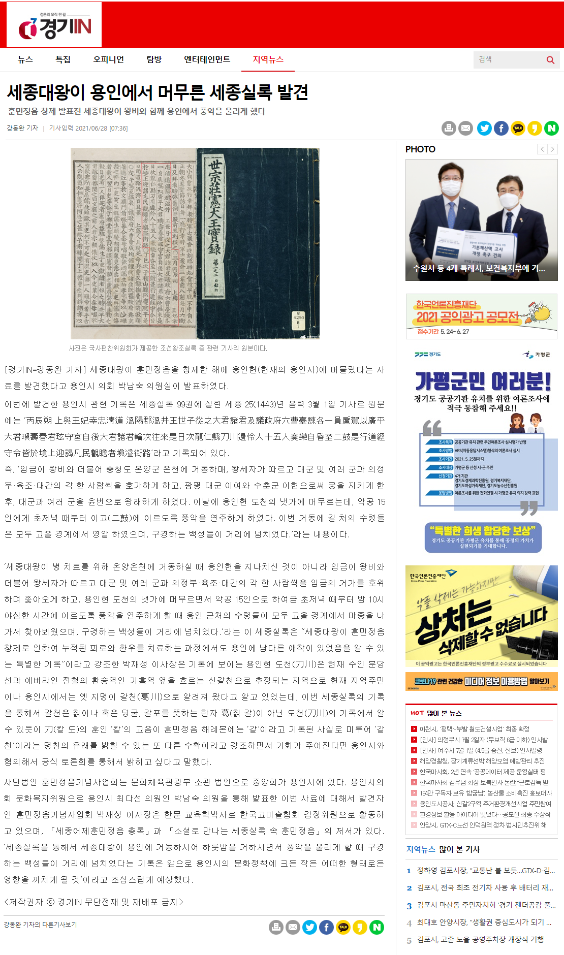 [경기인터넷신문]세종대왕이 용인에서 머무른 세종실록 발견
