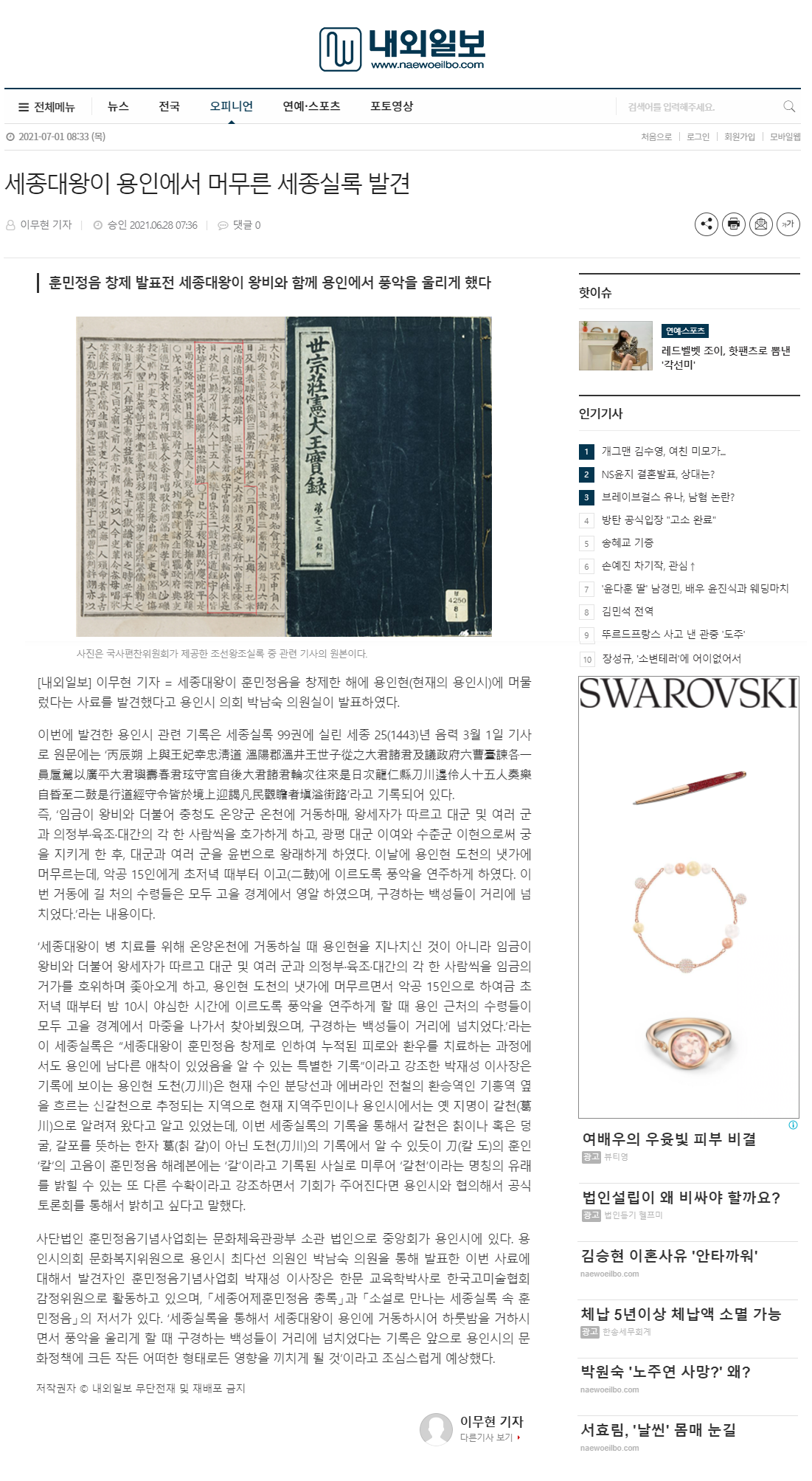 [국제뉴스]세종대왕이 용인에서 머무른 세종실록 발견