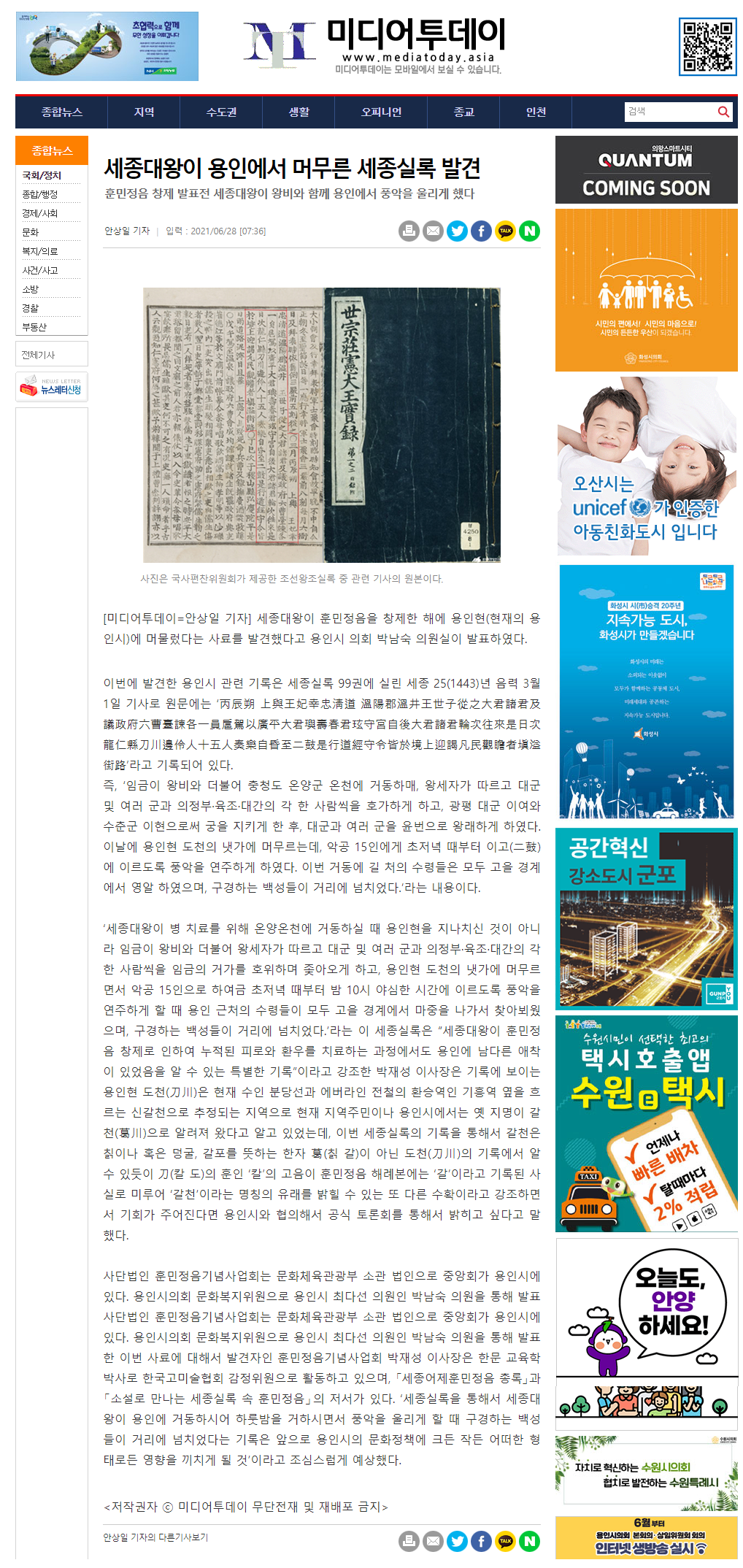 [미디어투데이]세종대왕이 용인에서 머무른 세종실록 발견