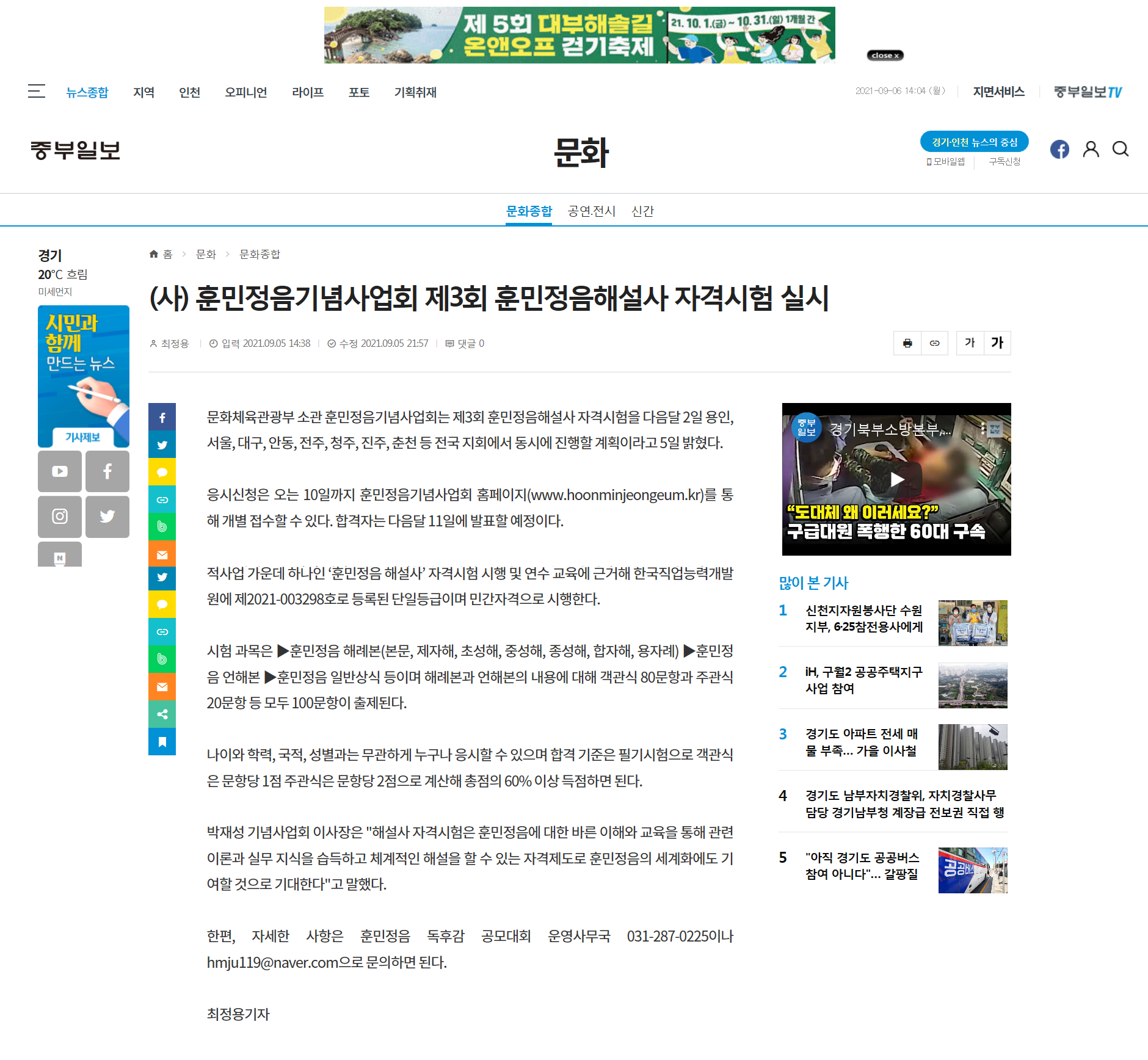 [중부일보]제3회 훈민정음해설사 자격시험 실시
