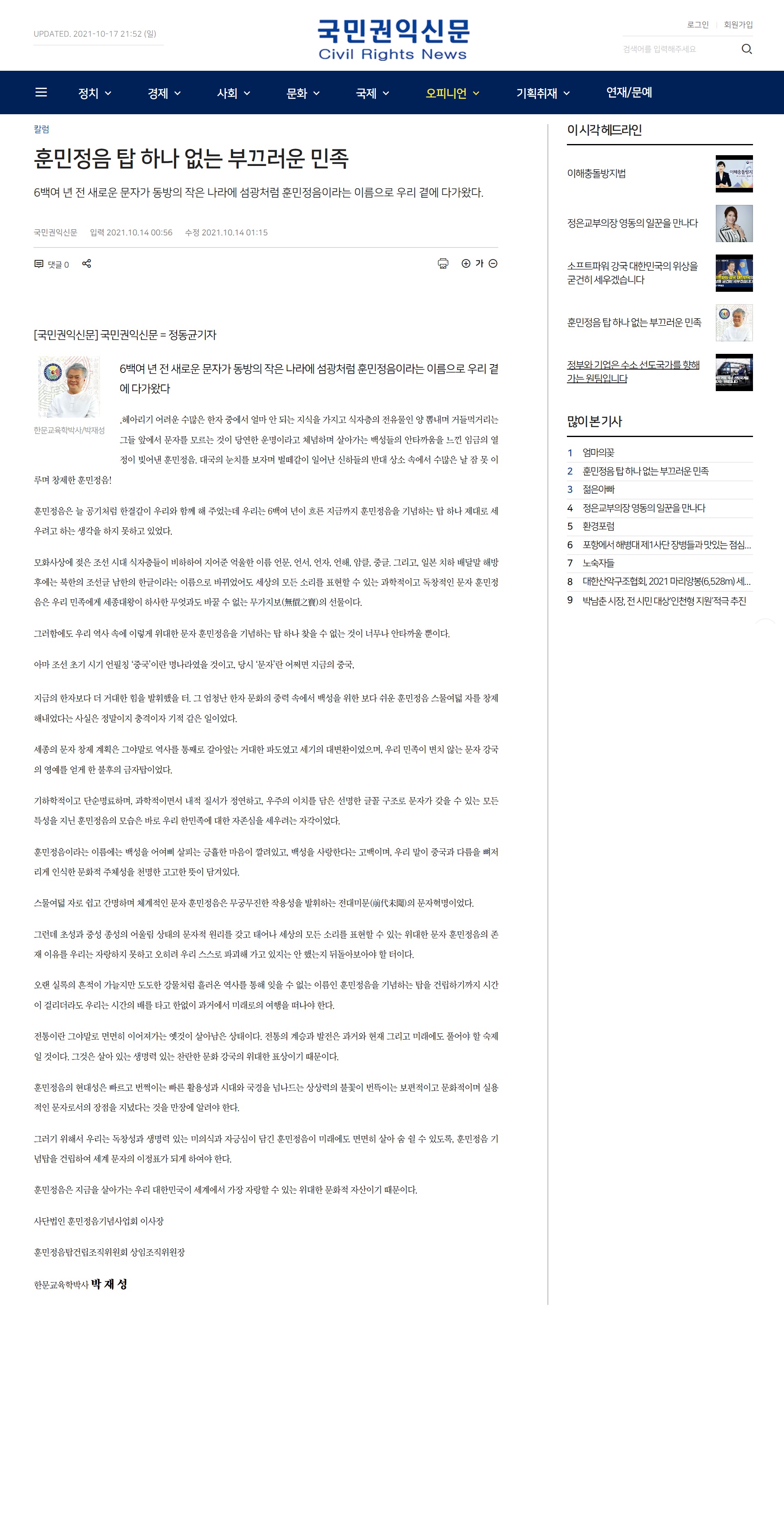 [국민권익신문]훈민정음탑 하나 없는 부끄러운 민족
