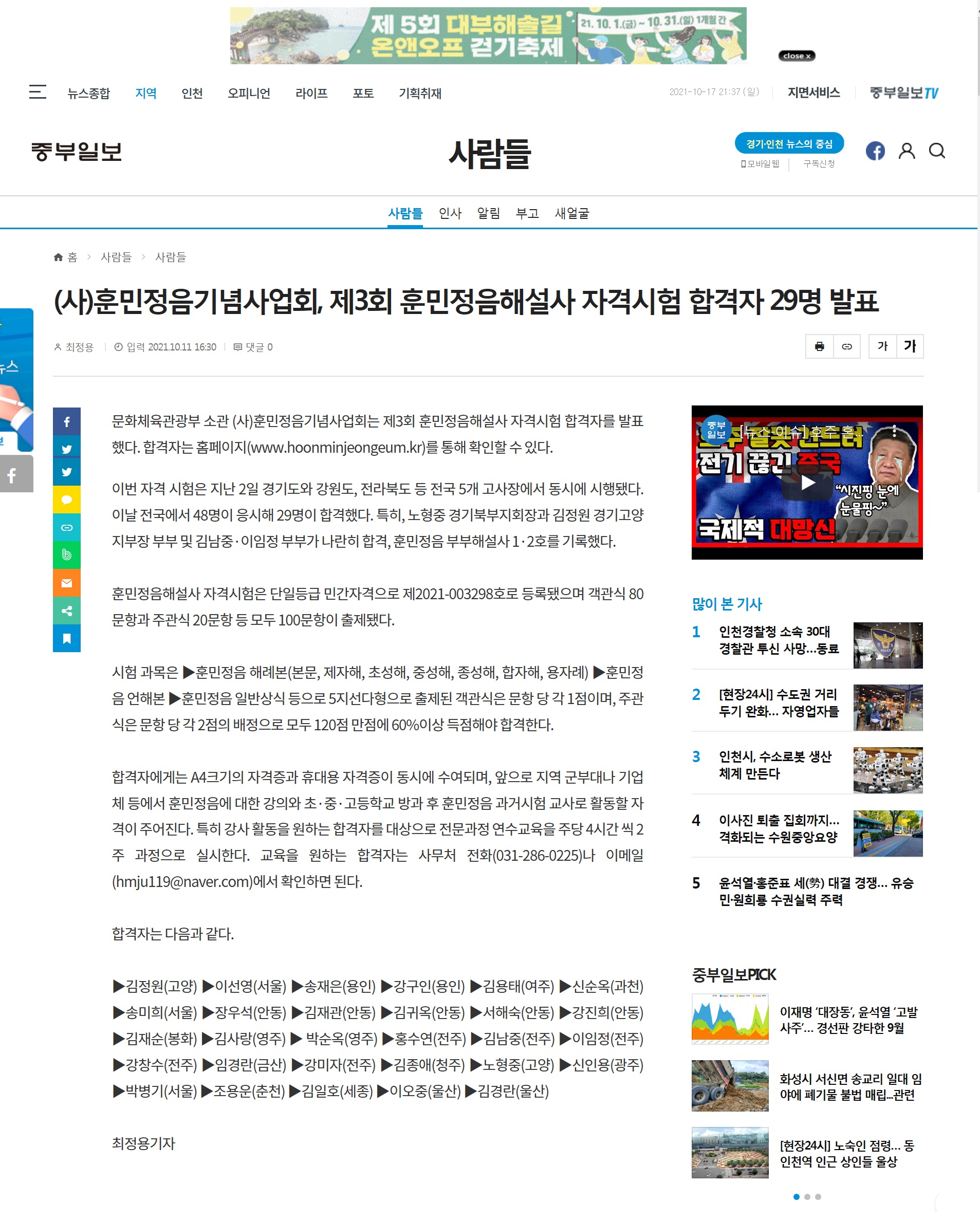 [중부일보]제3회 훈민정음 해설사 자격시험 합격자 발표