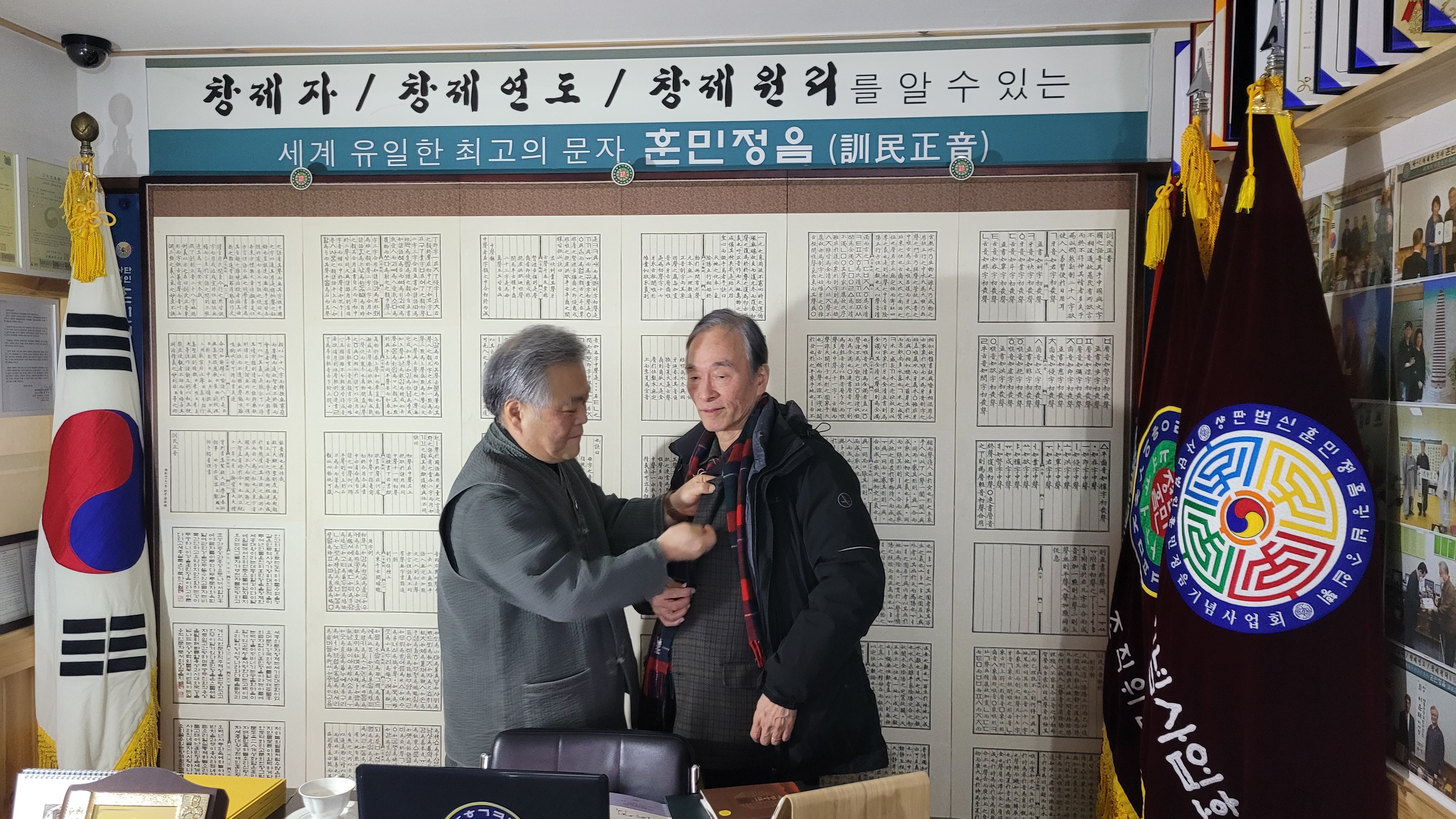 이에 박 이사장은 즉석에서 이상면 박사에게 고문 위촉장을 수여한 뒤 훈민정음 뱃지를 달아주고 약 2시간여 동안 환담을 하였다.<이금로 사무처장>