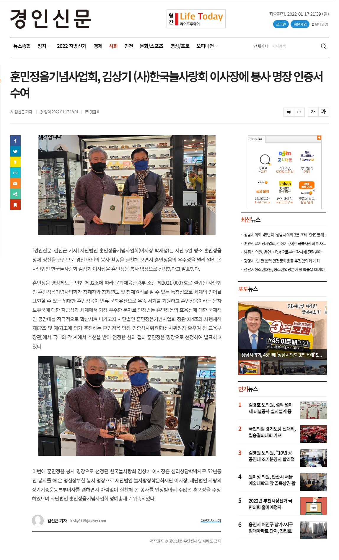 훈민정음기념사업회, 김상기 (사)한국늘사랑회 이사장에 봉사 명장 인증서 수여 < 사회 < 기사본문 - 경인신문 (asn24.com)