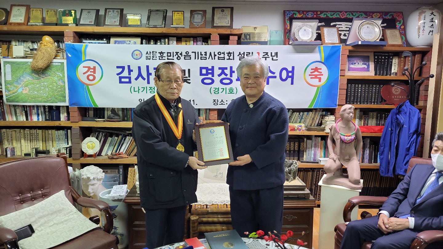 2022년 3월 11일(금) 오후 6시 30분 사단법인 훈민정음기념사업회 충북지회(지회장 김동연) 사무실에서 본 회 박재성 이사장은 법인 설립 1주년을 기념하여 그동안 훈민정음탑 건립과 훈민정음대학원대학교 설립부지를 무상 기증한 나기정 사단법인 세계직지문화협회 회장(전 청주시장)에게 회원들의 감사의 마음을 담아서 감사패를 수여하였다. 이와 함께 경기호 훈민정음전통주명장에게 명장 인증패를 수여하였한 후 참석자들과 만찬을 하면서 훈민정음기념사업회의 발전 방향에 대해 깊이 있는 대화를 나누었다. 이날 감사패 및 인증패 수여식을 축하해 주기 위하여 박근영 공동운영위원장, 이동주 훈정회 기획처장, 이금로 훈정회 사무처장과 장현석 훈민정음고건축 명장, 김동연 훈민정음서예명장, 조성옥 훈민정음석각명장, 박영덕 훈민정음각자명장 등 청주지역에서 활동하는 훈민정음 명장은 물론 제6기 훈민정음해설사 자격을 취득한 김제홍 강릉영동대학교 전 총장, 장정수 세종탁주 대표, 정정옥 강릉영동대호텔리조트과 교수, 이한나 청주시의회 홍보팀 공무원 등이 함께 했다.