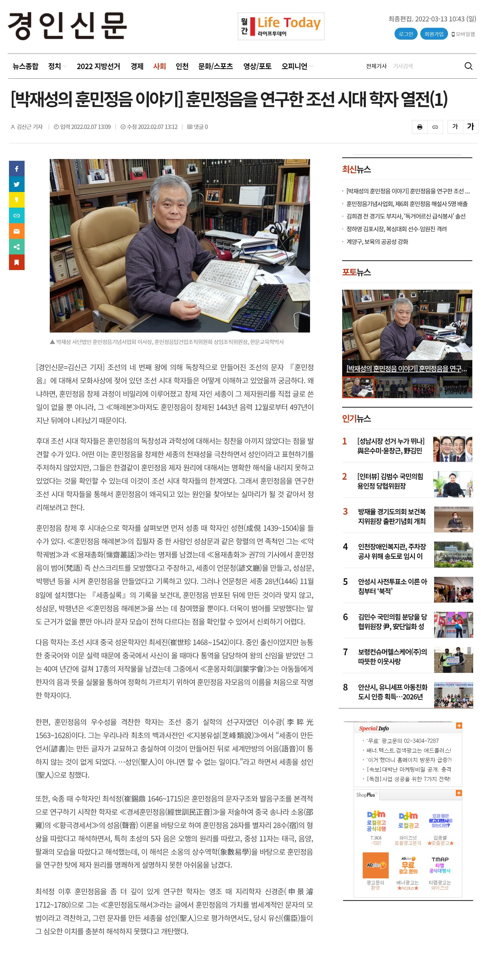 [경인신문] 훈민정음을 연구한 조선시대 학자 열전(1)