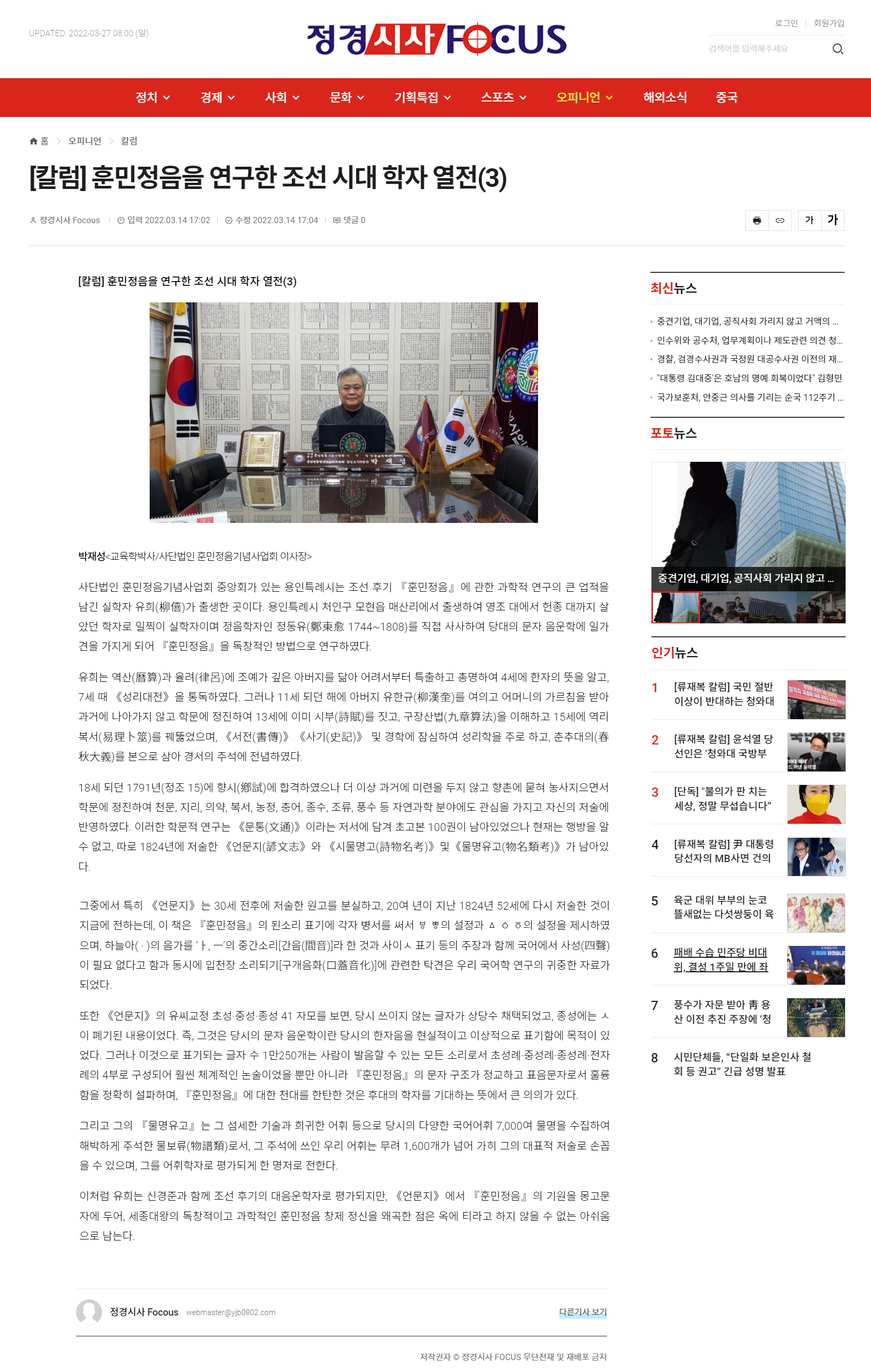 [칼럼] 훈민정음을 연구한 조선 시대 학자 열전(3) < 칼럼 < 오피니언 < 기사본문 - 정경시사 FOCUS (yjb0802.com)