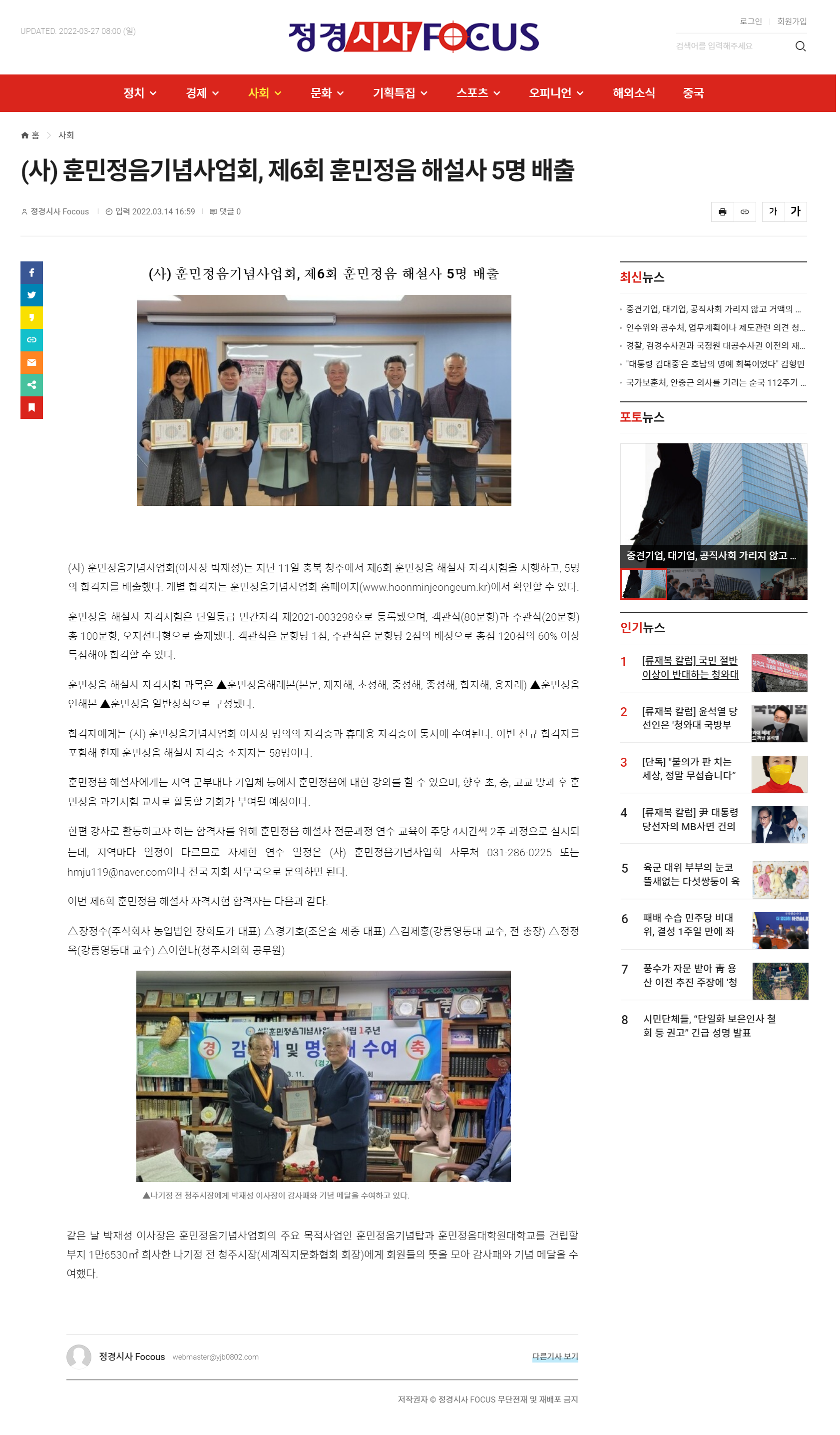 (사) 훈민정음기념사업회, 제6회 훈민정음 해설사 5명 배출 < 사회 < 기사본문 - 정경시사 FOCUS (yjb0802.com)