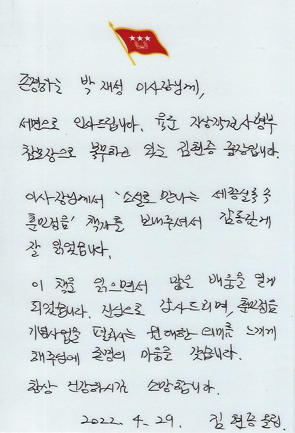 지상작전사령부 참모장 김현종 중장 친필 감사서신