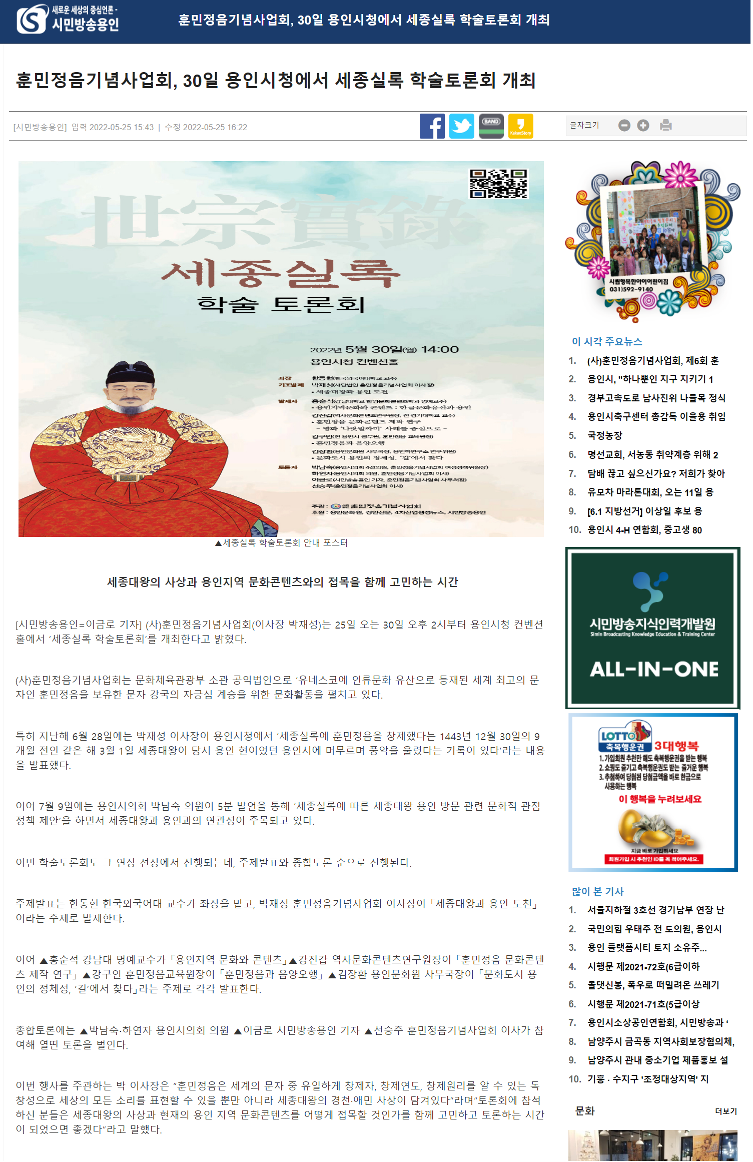 [시민용인방송] 세종실록 학술토론회 성공개최