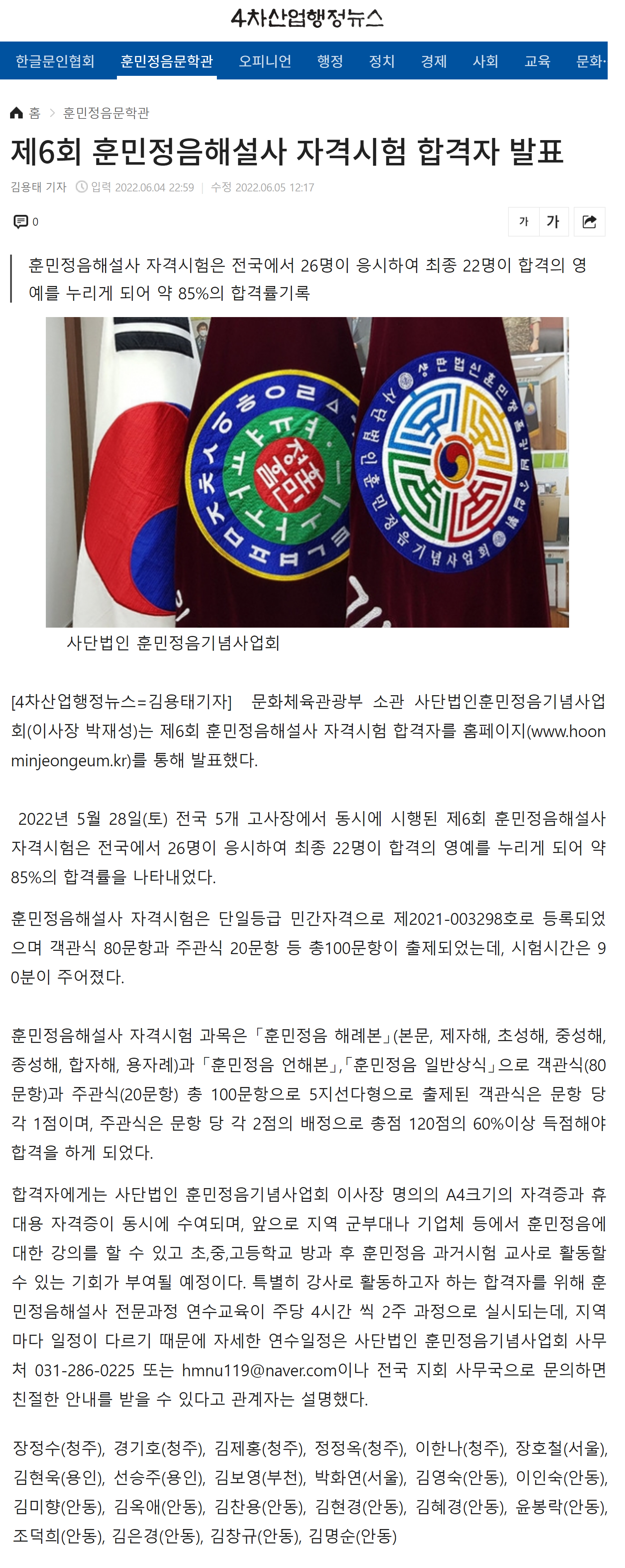 [4차산업행정뉴스] 제6회 훈민정음해설사 자격시험 합격자 발표