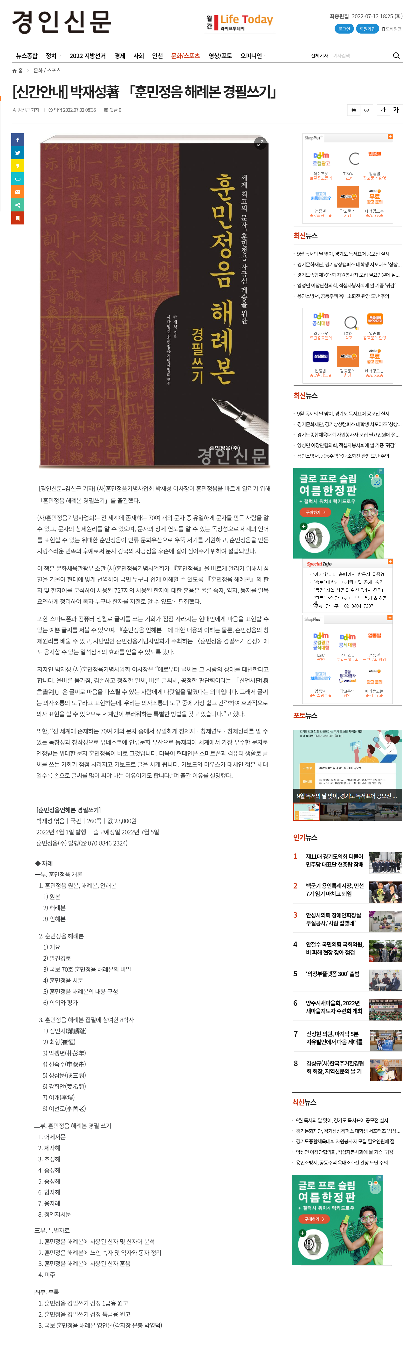 [경인신문] 훈민정음 해례본 경필쓰기 도서 출간