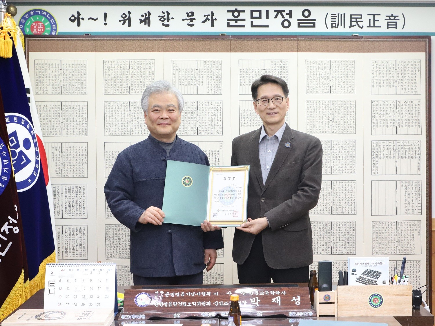 2023년 3월 28일(화) 오후 2시 사단법인 훈민정음기념사업회 박재성 이사장은 지난 임시총회에서 선출된 신임 이사와 감사에게 임명장을 수여하고 훈민정음기념사업회 발전을 위해 헌신해 줄 것을 당부하였다. 사진 좌로부터 김현욱 감사(용인경제발전협의회 대표) 김동연 이사(사단법인 세계문자서예협회 이사장) 박재성 이사장, 이상식 이사(전 부산지방경찰청 청장) 이금로 감사(전 국민은행 지점장)