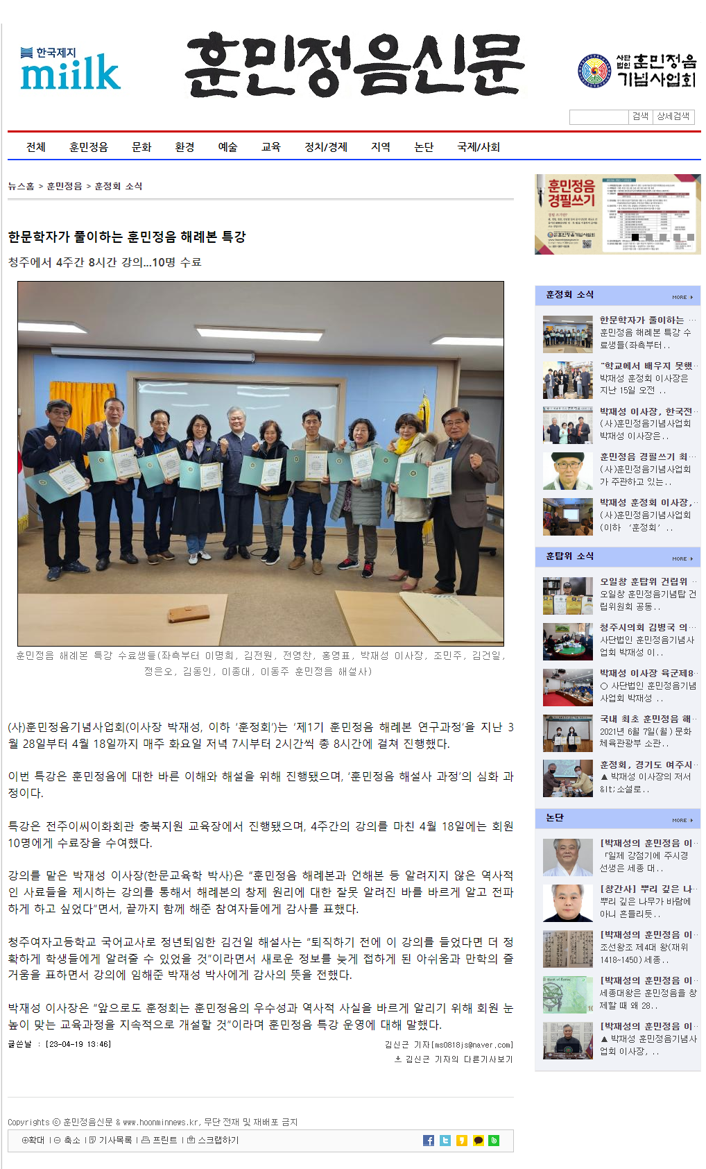[훈민정음신문] 용인시 초중등생 대상 교양강좌 실시