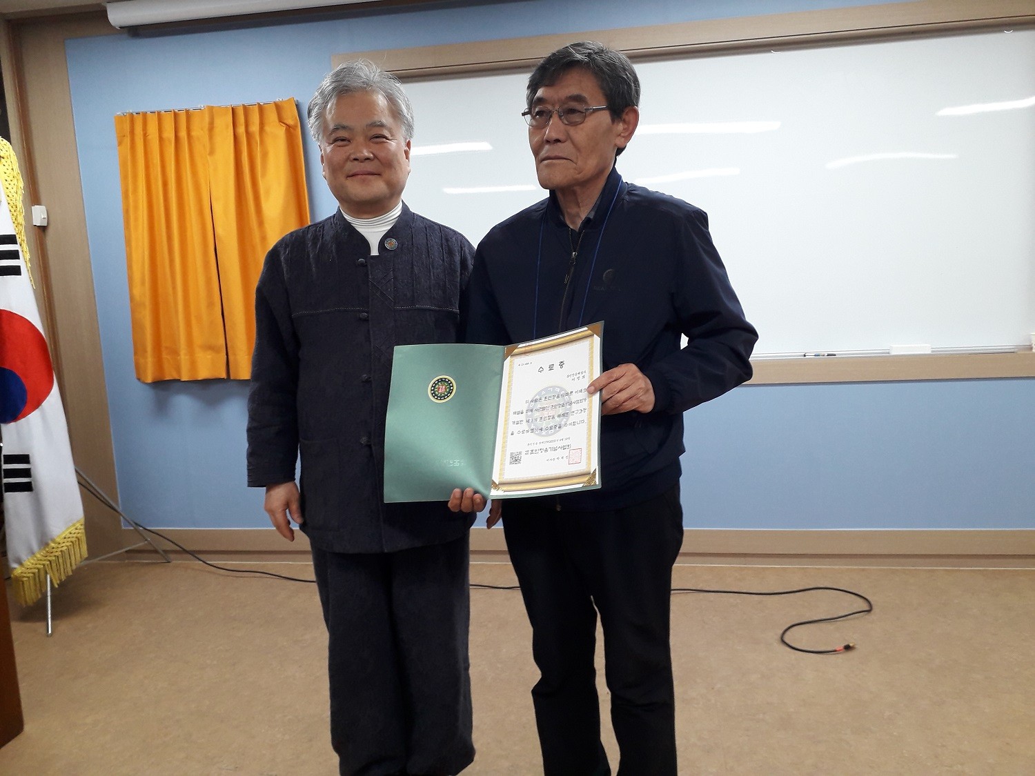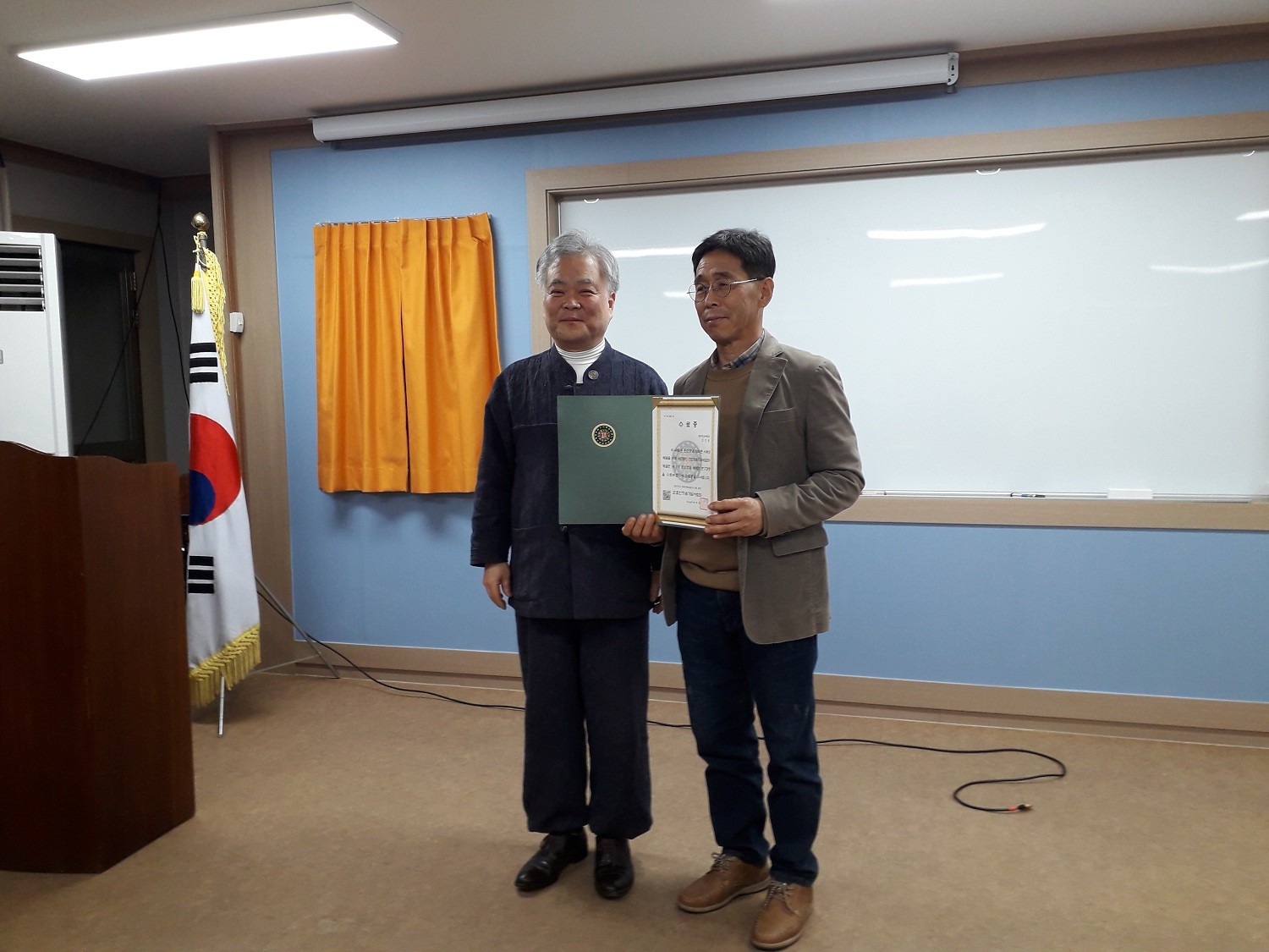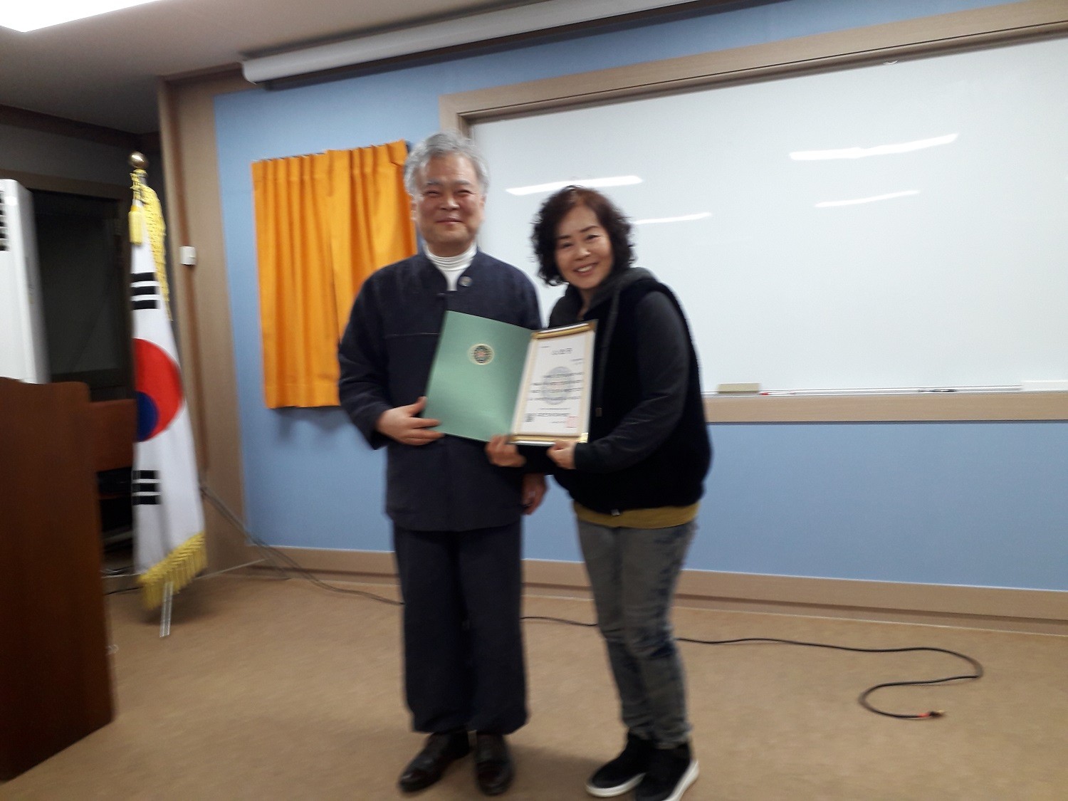 제1기 훈민정음 해례본 연구과정 수료생들 좌로부터 이명희, 김전원, 전영찬, 홍영표, 박재성 이사장, 조민주, 김건일, 정은오, 김동인, 이종대, 이동주 훈민정음해설사