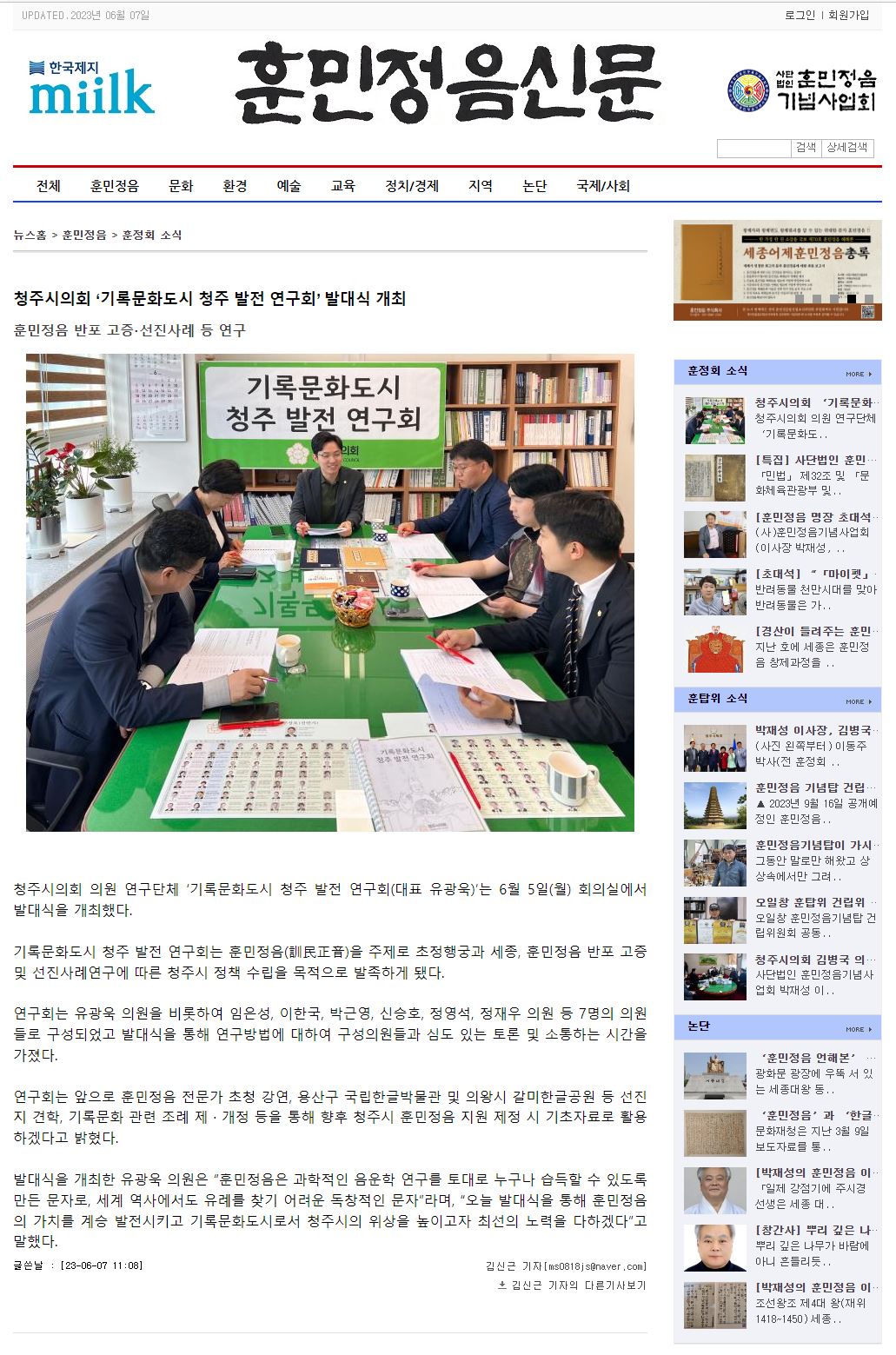 [훈민정음신문] 청주시의회 '기록문화도시 청주 발전 연구회' 발대식 개최
