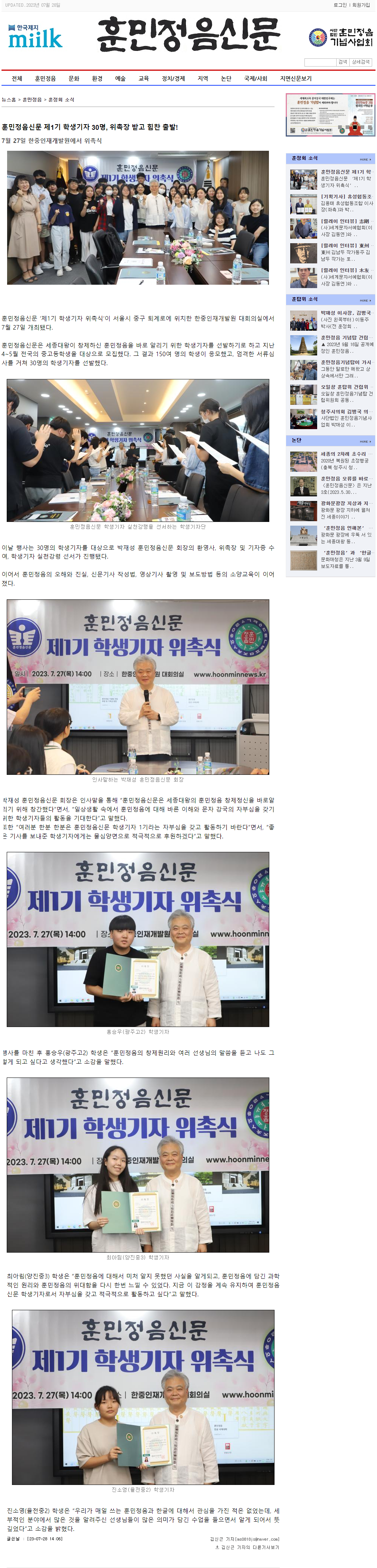 [훈민정음신문] 제1기 학생기자 30명 위촉장 받고 힘찬 출발!