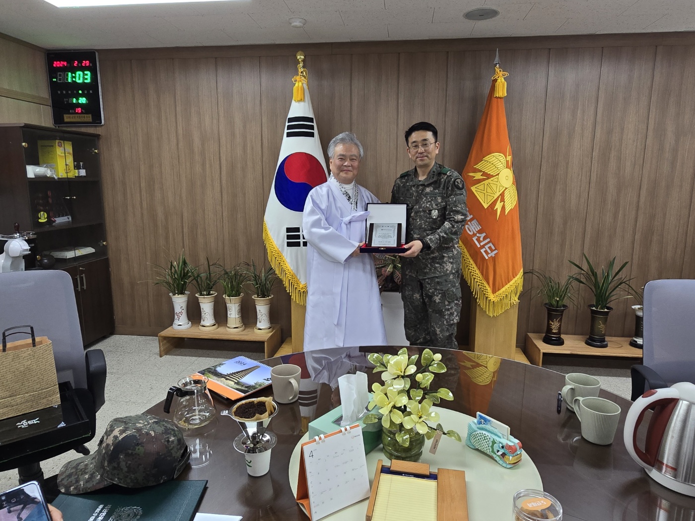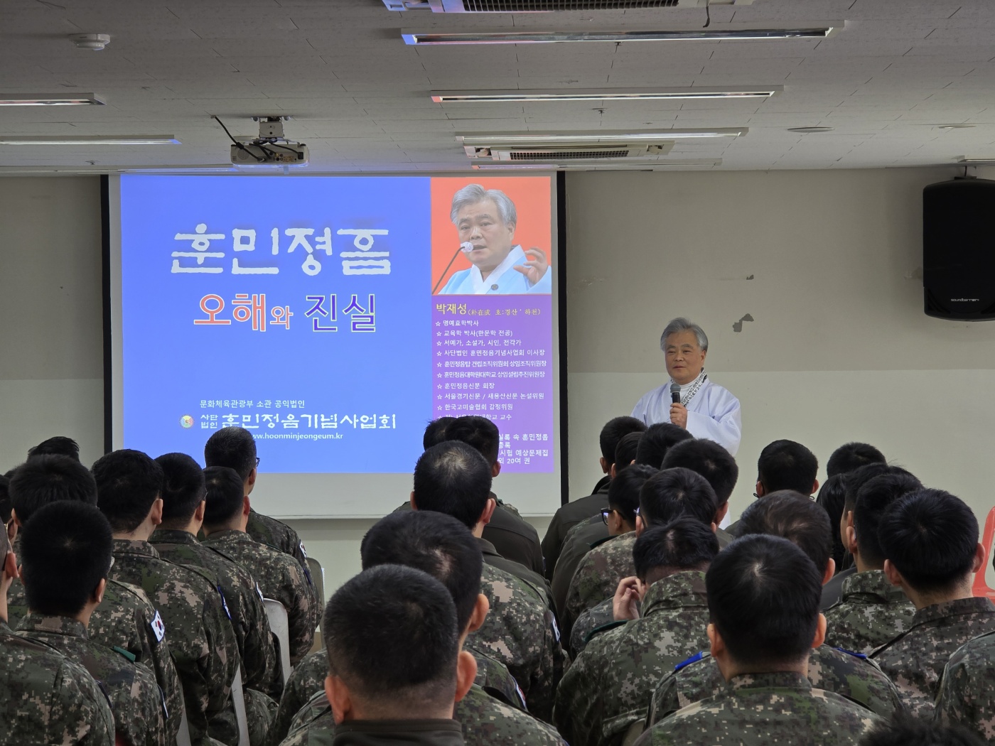 2024년 2월 29일(목) 사단법인 훈민정음기념사업회 박재성 이사장은 경기도 포천시에 있는 제5군단(군단장 김성민 중장) 예하 105정보통신여단(여단장 임성용 대령)의 초청을 받고 부대를 방문하여 오후1시부터 3시까지 '훈민정음 오해와 진실'이라는 주제로 용사 170여 명과 소속 군무원을 대상으로 특강을 하였다. 임성용 정보통신여단장은 이날 박재성 이사장에게 감사패를 증정하여 감사의 뜻을 전했다.
