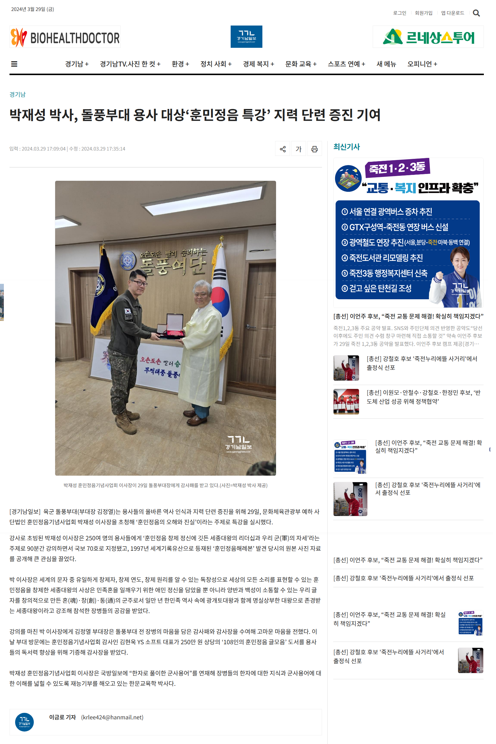 [경기남일보] 돌풍부대 용사 대상 '훈민정음 특강' 지력 단련 기여