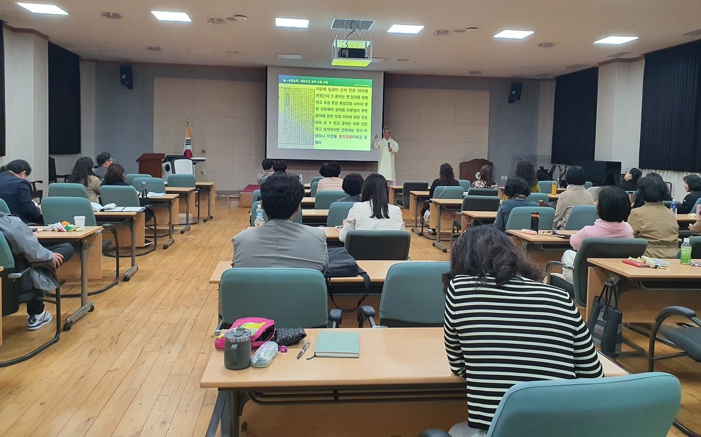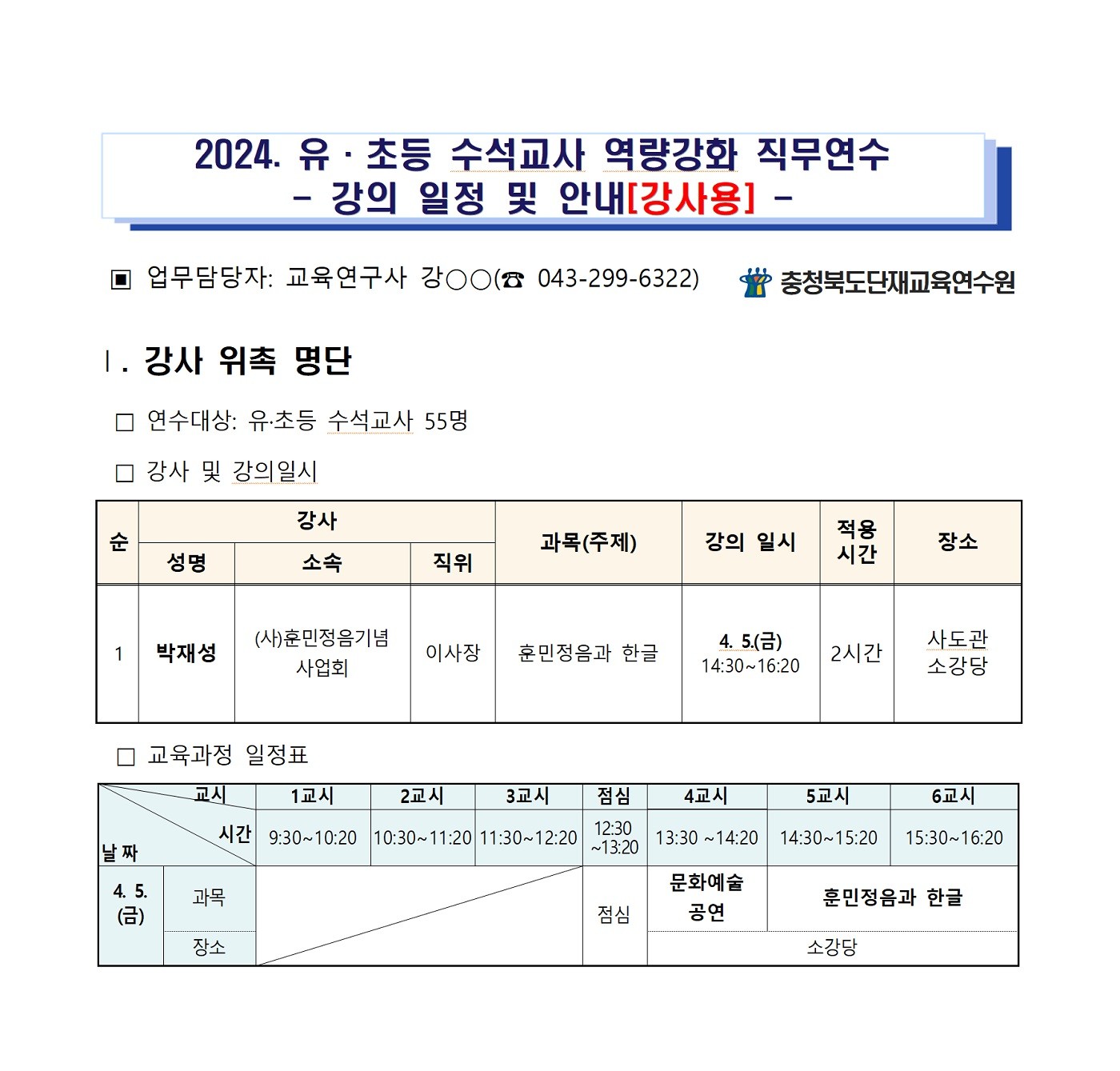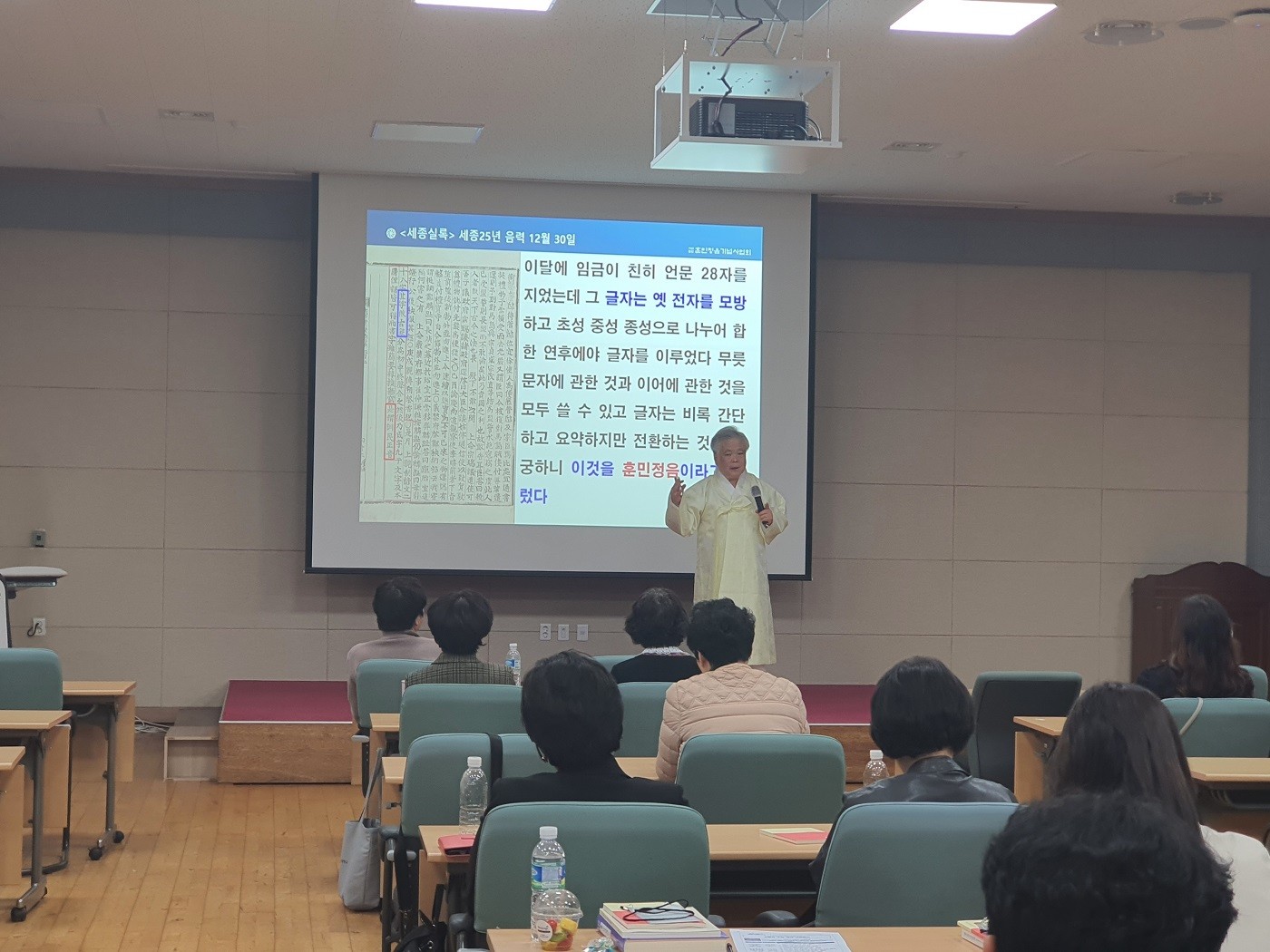 사단법인 훈민정음기념사업회 이사장 박재성 교육학박사는 충북 청주시 상당구 가덕면 교육원로 153-100에 위치한 단재교육연수원(본원)에서 실시된 2024. 유초등 수석교사 역량강화 직무연수에 특별강사로 초빙되어 '훈민정음과 한글'이라는 주제로 2024년 4월 5일(금) 오후 2시30분부터 4시20분까지 유초등 수석교사 55명을 대상으로 특강을 하였다. 세종실록을 근거로 훈민정음의 오해와 진실에 대해서 강의를 진행하면서 훈민정음기념탑 건립의 필요성에 대하여 역사적 사실(史實)을 바탕으로 역설하여 참석한 교사들로부터 뜨거운 호응을 받았다. 이날 박 이사장은 수강생 전원에게 특허받은 '2024년 훈민정음 달력'을 증정하여 훈민정음기념사업회를 알리는 것도 잊지 않았다.