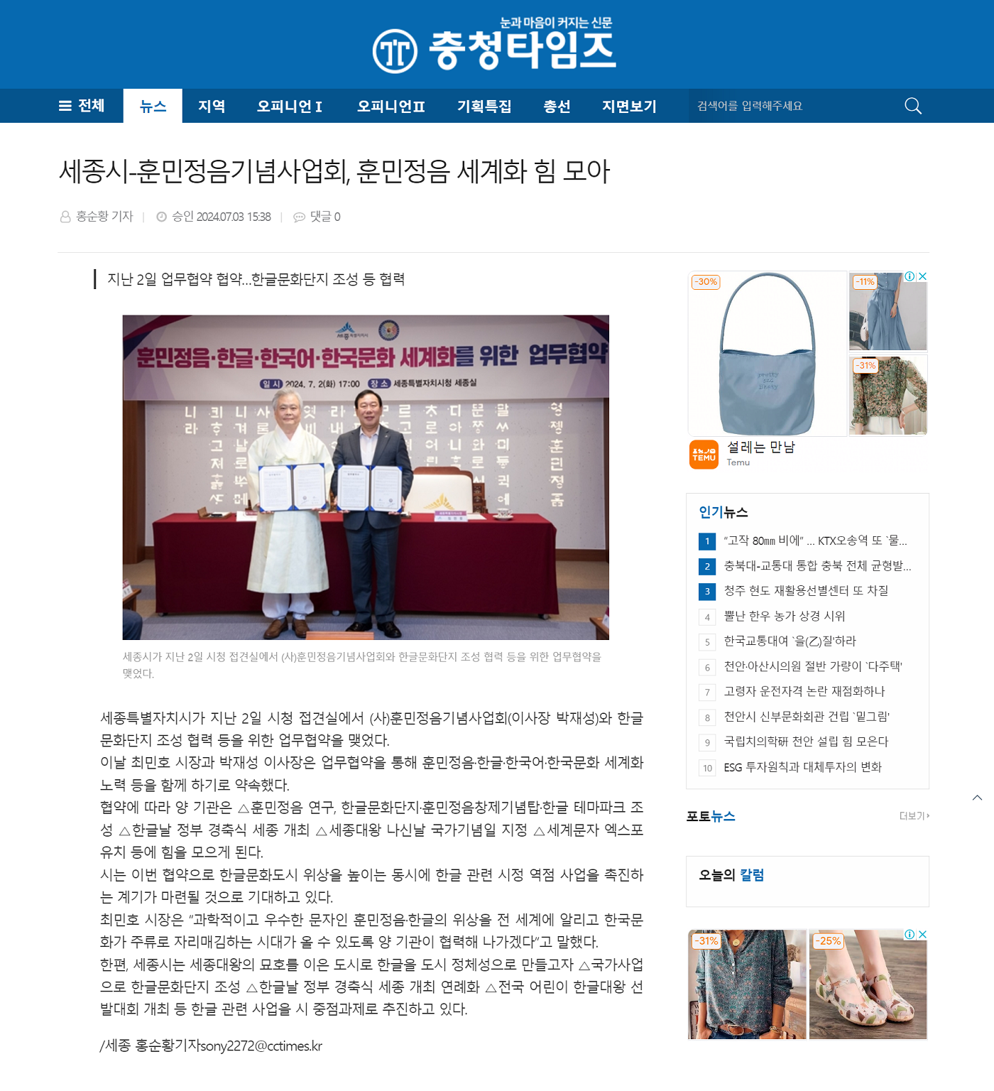 [충청타임즈] 세종시-훈민정음기념사업회, 훈민정음 세계화 힘 모아