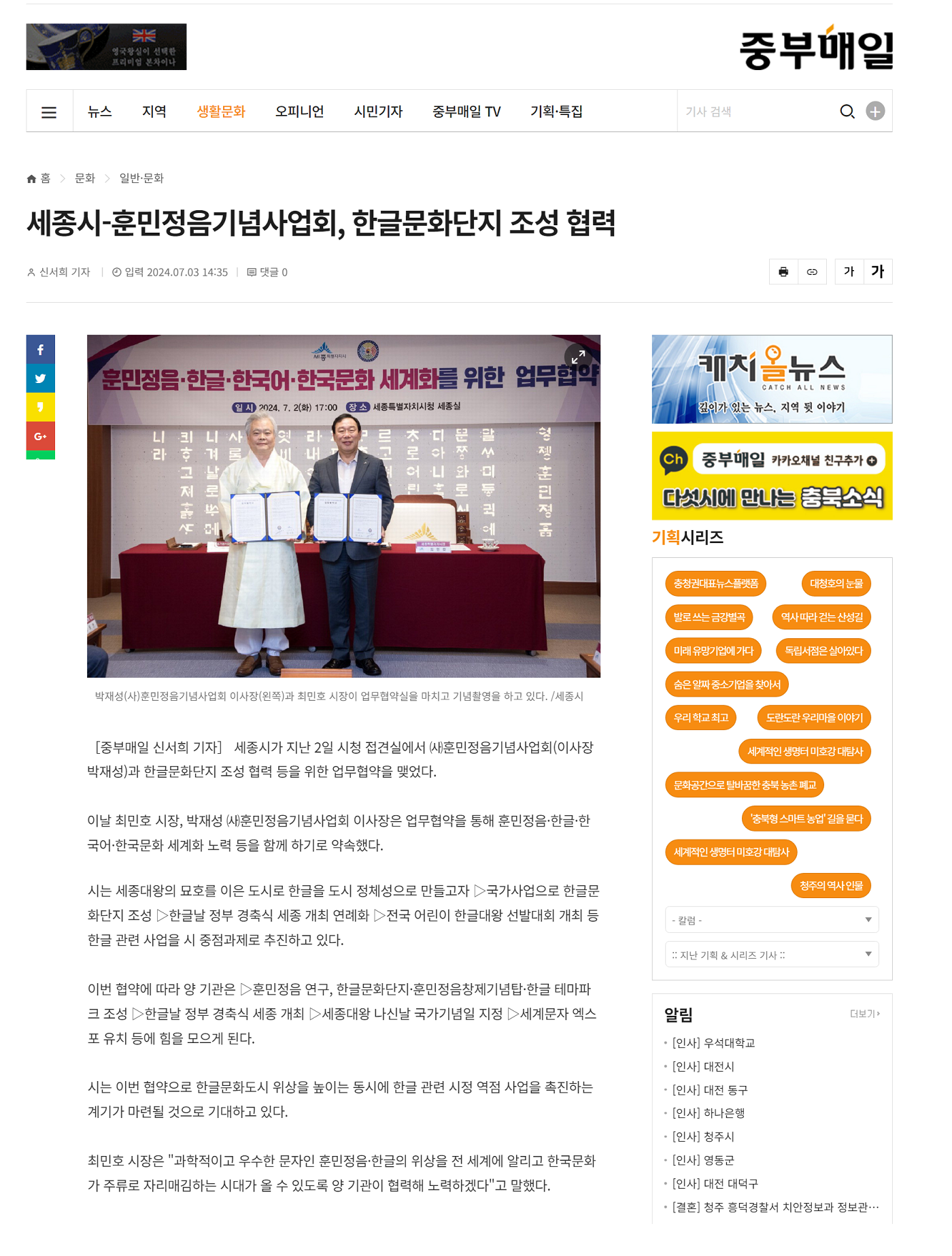 [충북일보] 세종시-훈민정음기념사업회, 훈민정음 세계화 협력