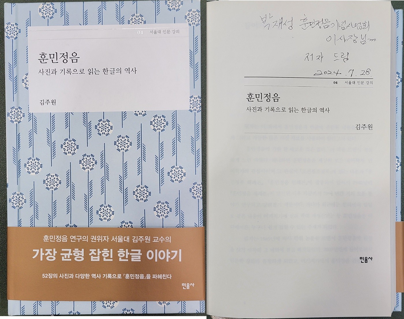 사단법인 훈민정음기념사업회 박재성 이사장은 2024년 7월 28일 한글학회 김주원 회장(서울대명예교수/훈민정음학회 초대회장)을 김주원 회장의 초대를 받아서 김회장 자택 부근에서 만나서 약 1시간 30분동안 한글과 훈민정음에 대해서 깊이 있는 대화를 나누었다. 박재성 이사장의 저서 <우리말로 찾는 정음자전>을 증정해 드리고 싶다는 박재성 이사장의 제안을 받은 김주원 회장이 쾌히 화답하여 이루어진 이날 회동에서 김회장은 박이사장의 저서를 보고 "한사람이 만들 수 없는 역사적 저작물"이라고 극찬하면서 박이사장이 함께 증정한 저서 <훈민정음에서 길을 찾는다>는 책도 꼼꼼하게 읽어보겠다면서 훈민정음기념사업회와 박이사장의 눈부신 활동에 대해서 놀라움을 표하면서 김회장은 자신의 저서 <훈민정음 - 사진과 기록으로 읽은 한글의 역사>를 차에 있다면서 주차장으로 가서 승용차 보닛위에 책을 올려놓고 뙤약볕 아래에서 서명을 해주는 정성을 담아서 화답했다. 이날 회동에는 세종특별자치시 최민호 시장이 상경하여 함께 하였으며 세종특별자치시 류제일 미래전략기획본부장과, 훈민정음기념사업회 이선영 이사가 함께 하였다.