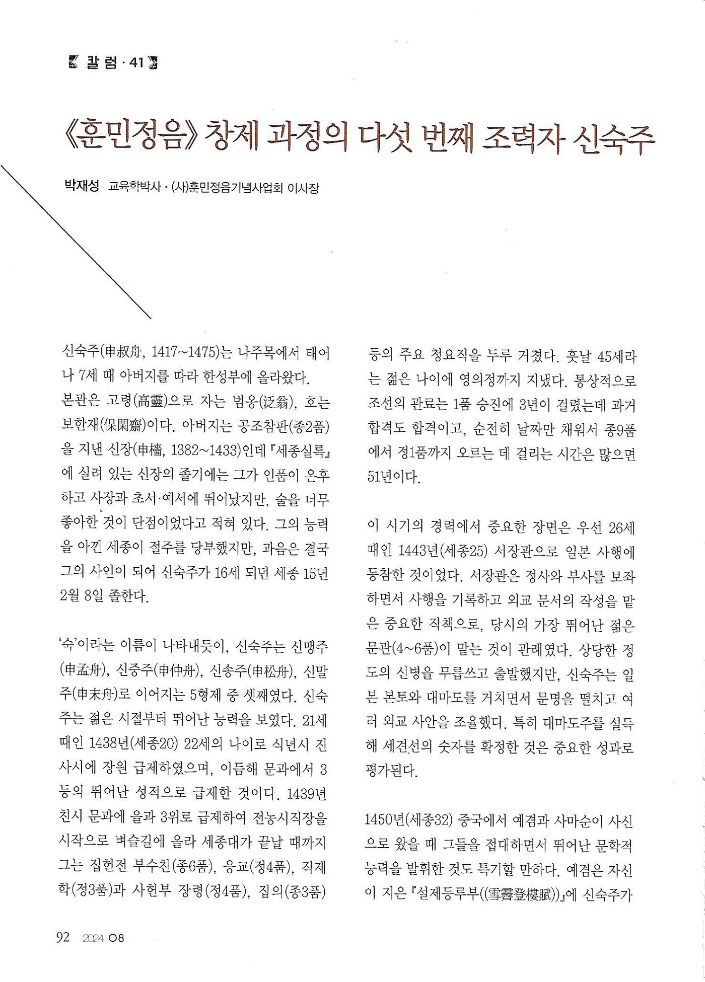 [월간서예문인화] 훈민정음 창제 과정의 네 번째 조력자 신숙주
