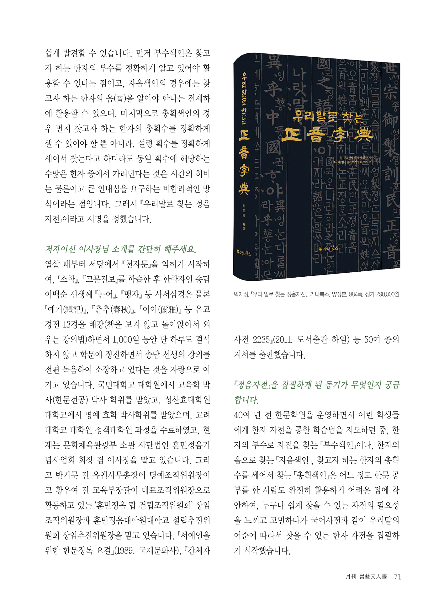 [월간서예문인화] 국내 유일의 '우리말로 찾는 정음자전' 출간한 박재성 이사장