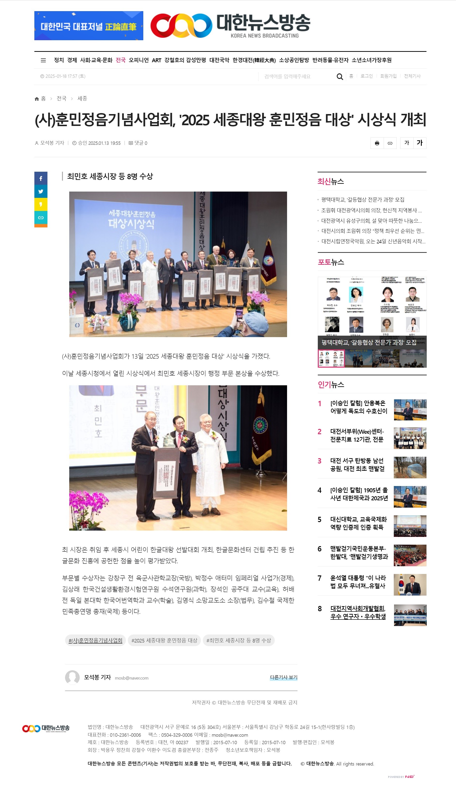 [대한뉴스방송] 2025 세종대왕 훈민정음 대상 시상식 개최
