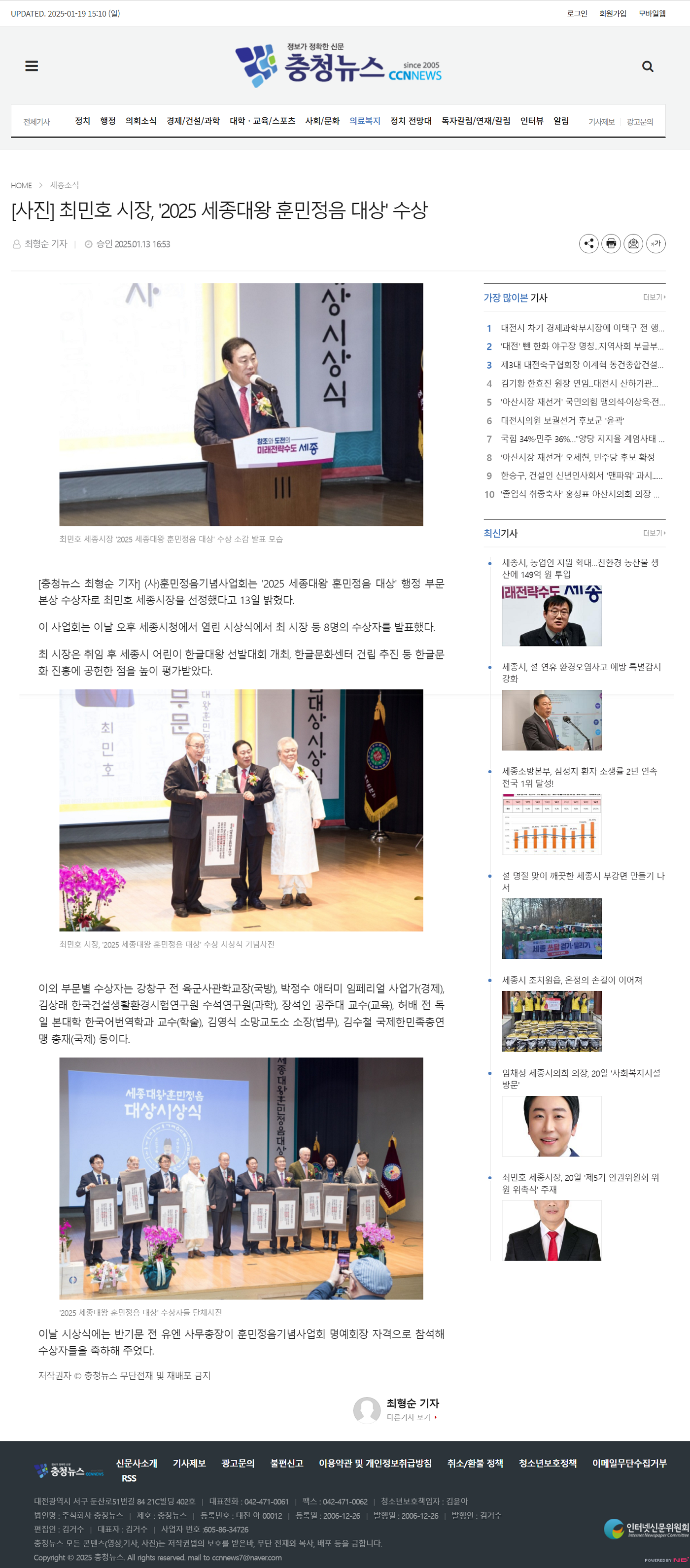 [충북일보] 최민호 세종시장, '2025 세종대왕 훈민정음 대상'수상