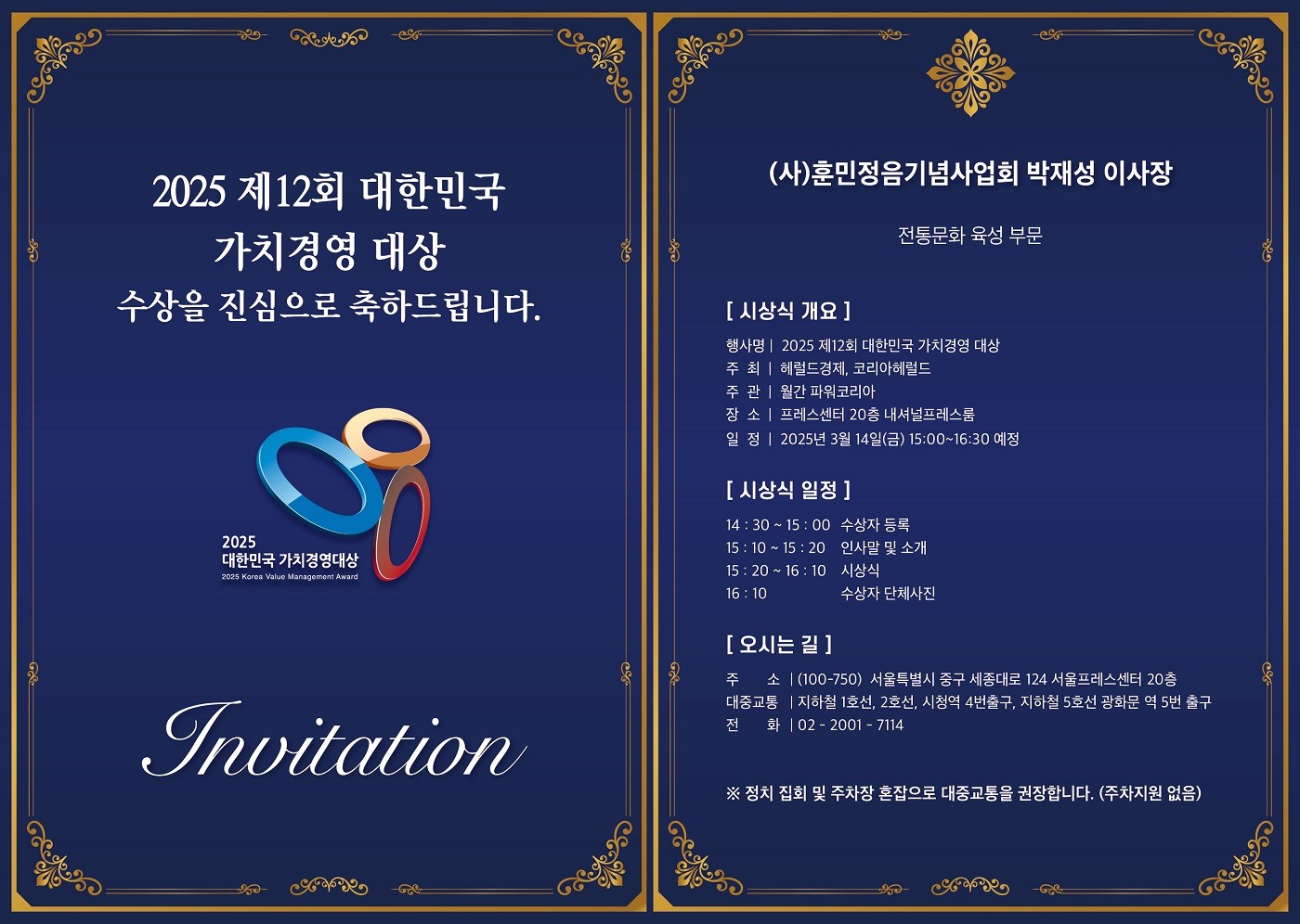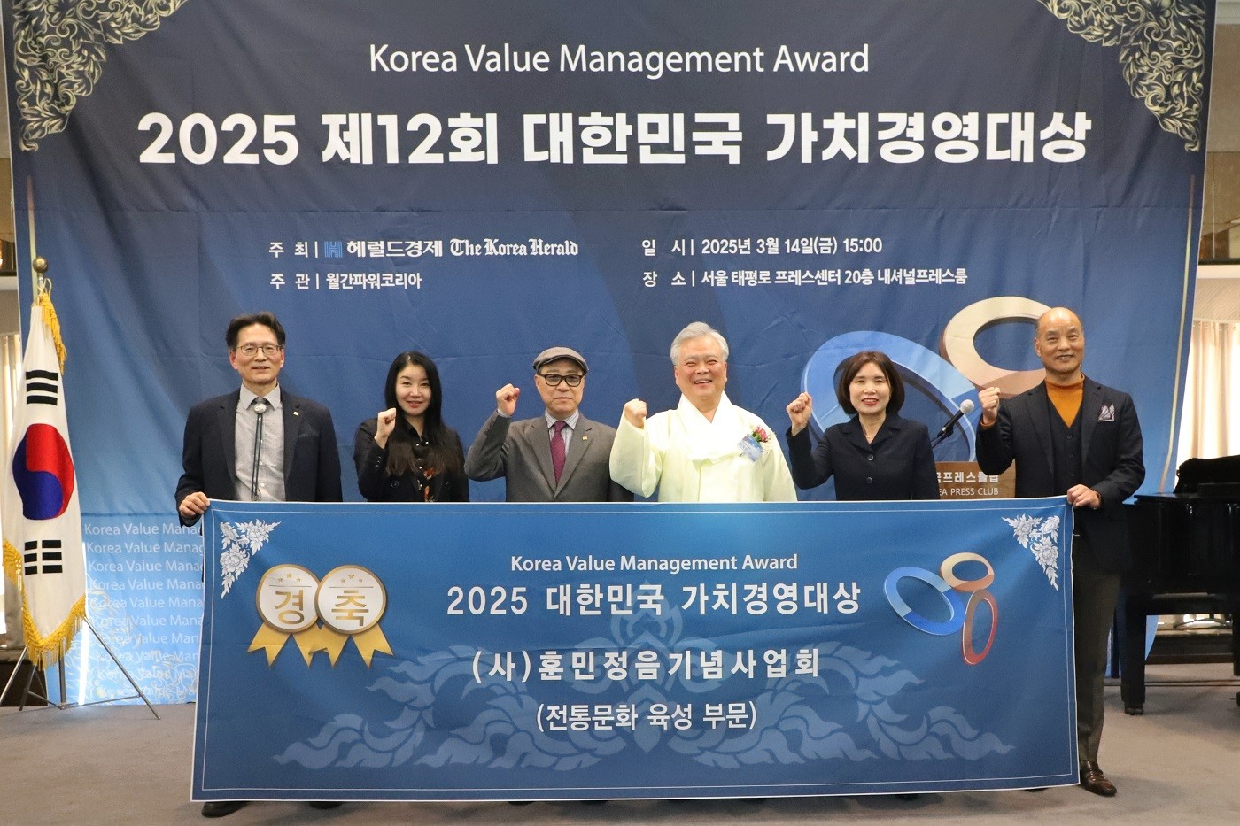 박재성 (사)훈민정음기념사업회 이사장은 3월 14일 서울 프레스센터에서 개최된 '2025 제12히 대한민국 가치경영대상'에서 전통문화 육성부문에 수상했다. 헤럴드경제, 코리아헤럴드가 주최하고 월간 파워코리아가 주관한 이번 시상식은 대한민국 우수, 유망기업(기관, 인물, 브랜드)의 고객가치경영 경쟁력을 평가 점검해 소비자들에게 올바른 기준을 제시하기 위해 마련했다. 박재성 이사장은 훈민정음 창제에 담긴 세종대왕의 애민정신과 훈민정음의 과학성과 독창성을 널리 알리기 위해 다양한 저술활동과 군부대 강연 등을 해왔다. 또한 훈민정음 창제를 기념하는 국가 상징물로서 훈민정음창제기념탑 건립을 위해 노력하는 등 전통문화 육성 분야에 가치경영 성과가 있다고 평가되면서 수상자로 선정됐다.