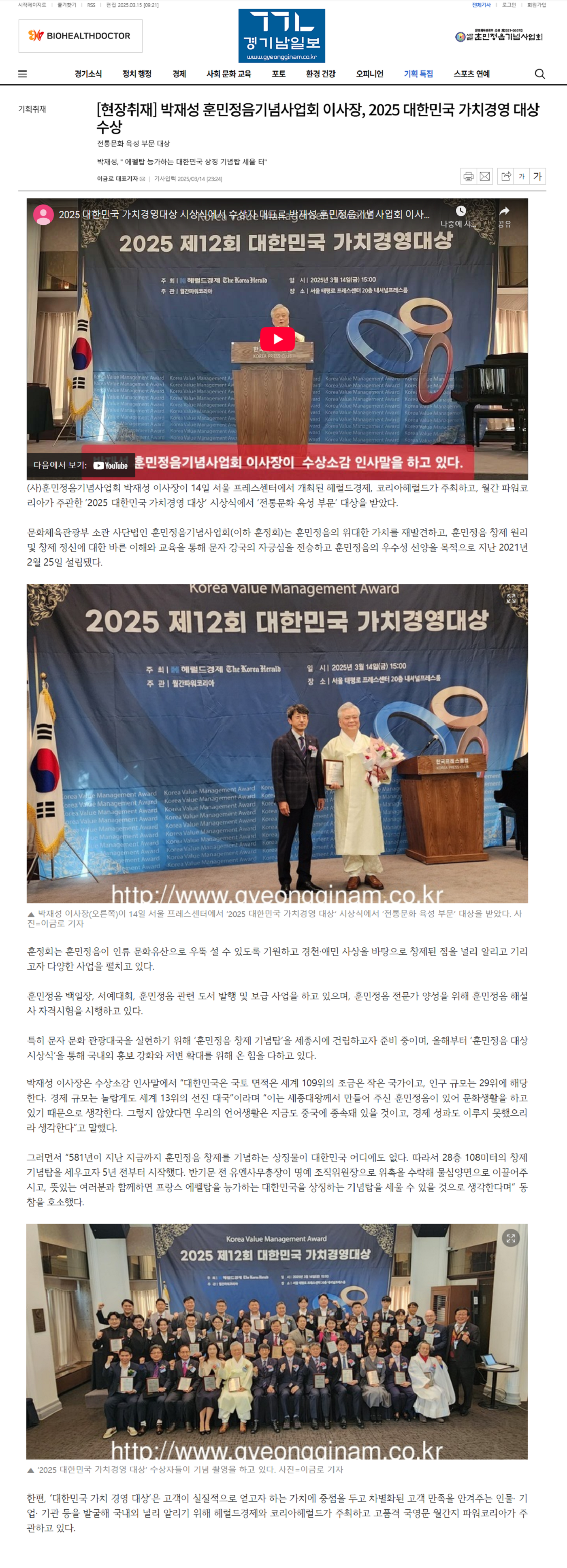 [경기남일보] 박재성 훈민정음기념사업회 이사장, 2025대한민국 가치경영대상 수상