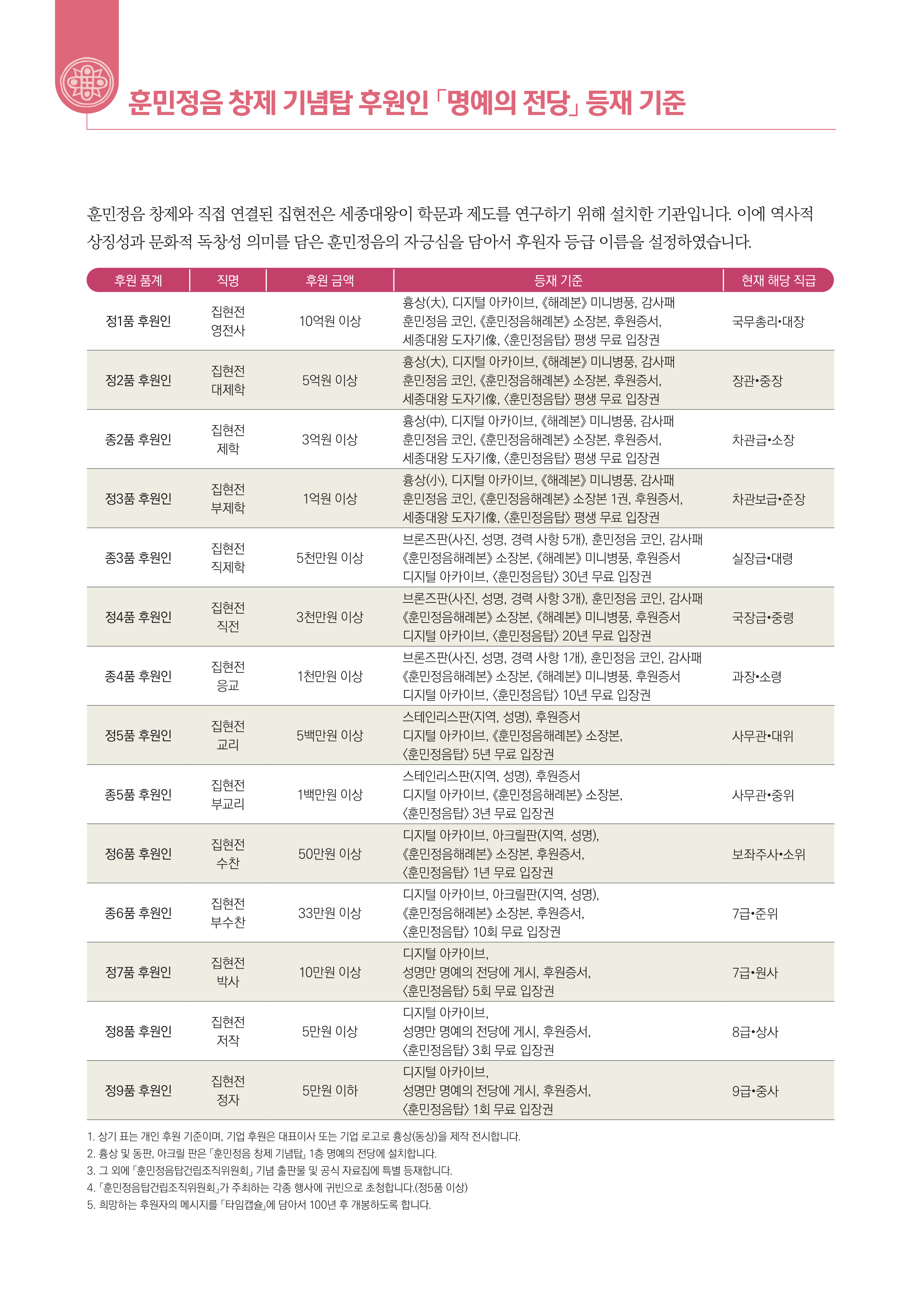 훈민정음 창제 기념탑 건립 후원인 <명예의 전당> 등재 기준
