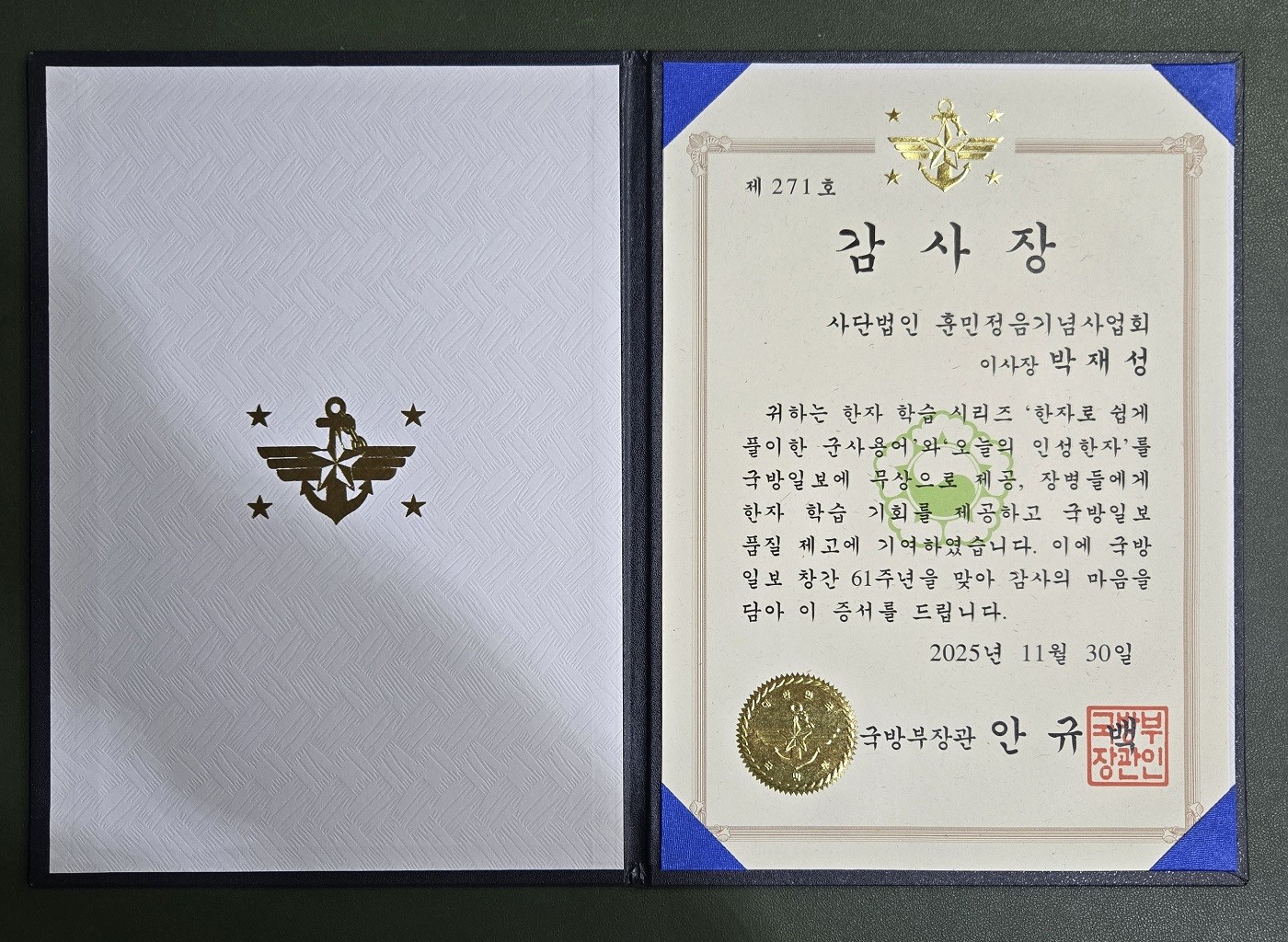 박재성 이사장 안규백 국방부장관 감사장 받아
