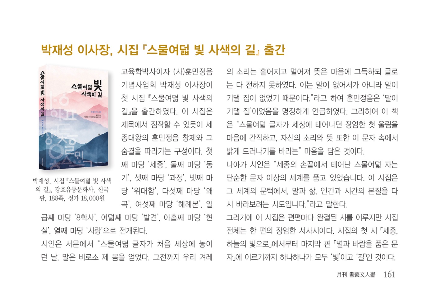 [월간서예문인화] 박재성 이사장, 시집 『스물여덟 빛 사색의 길』 출간