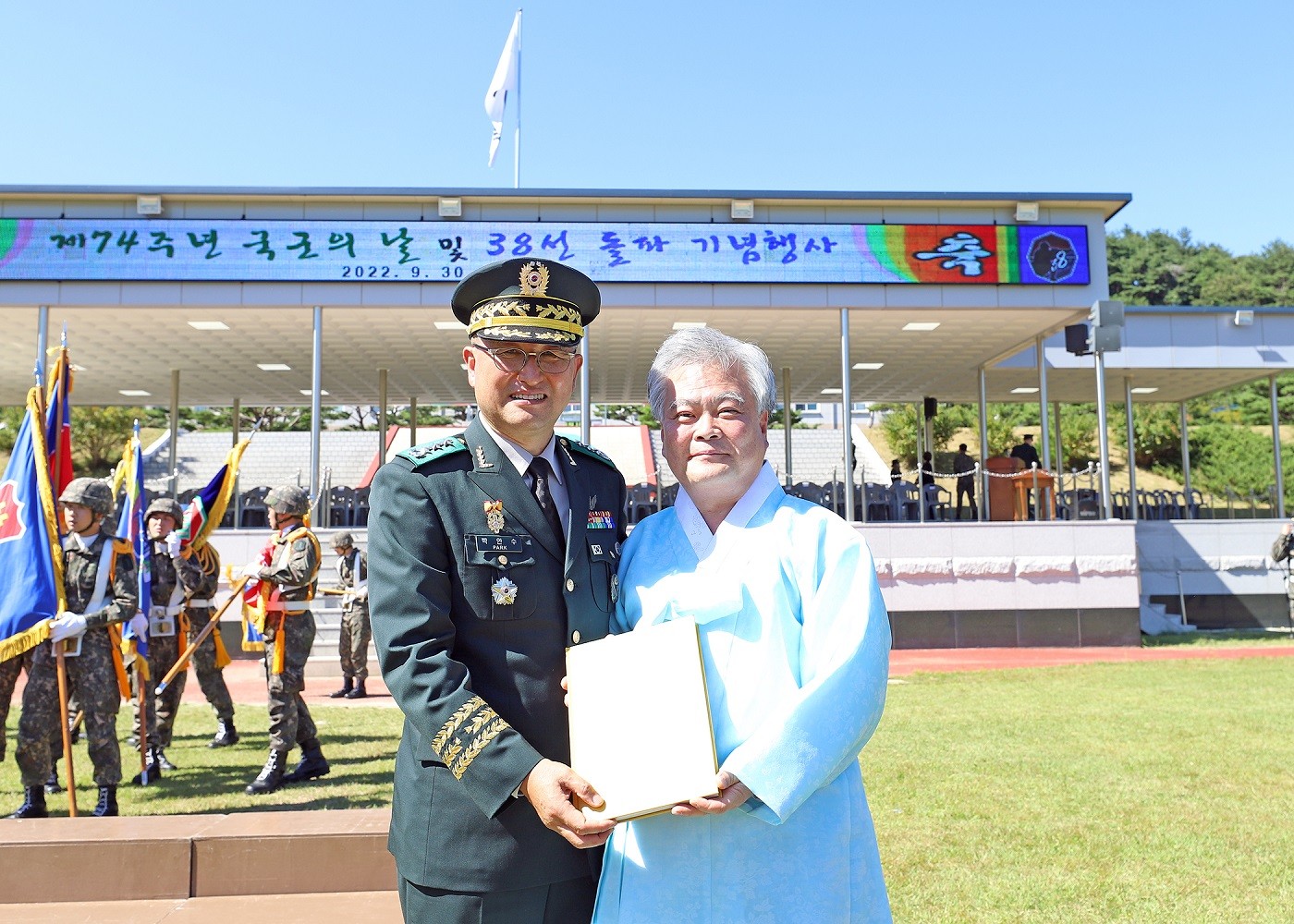2022년 9월 30일(금) 사단법인 훈민정음기념사업회 박재성 이사장은 위풍당당 충용군단 제8군단장 박안수 중장의 초청을 받아서 제74주년 국군의 날 및 38선 돌파 기념행사에 참석하였다. 박재성 이사장은 박안수 8군단장의 요청으로 군단 구호를 쓴 서예 작품을 증정하였다.