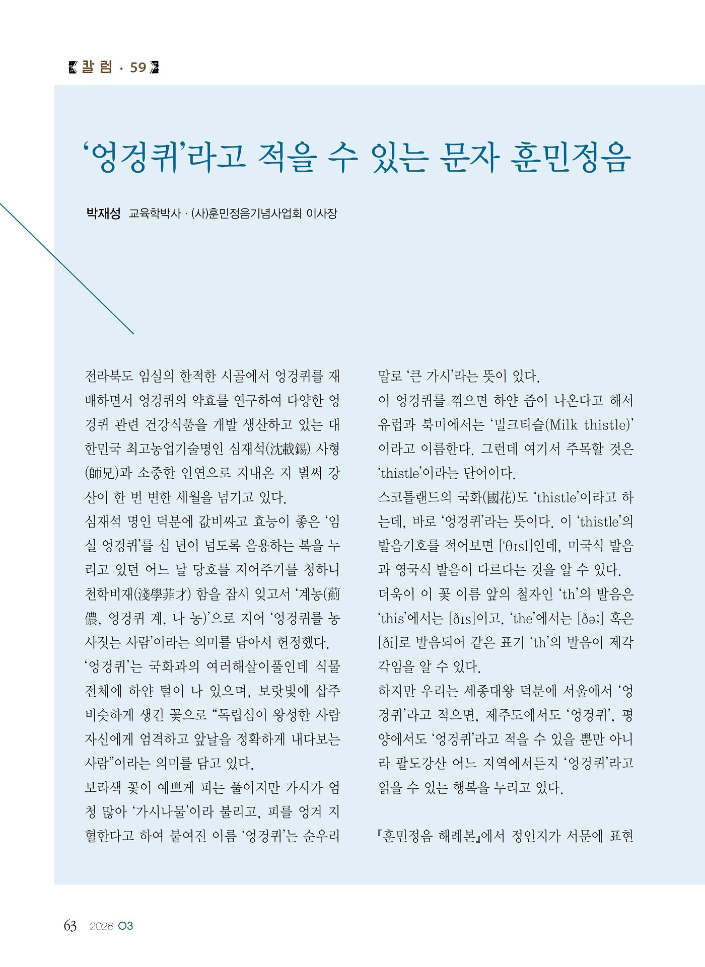 [월간서예문인화] '엉겅퀴'라고 적을 수 있는 문자 훈민정음