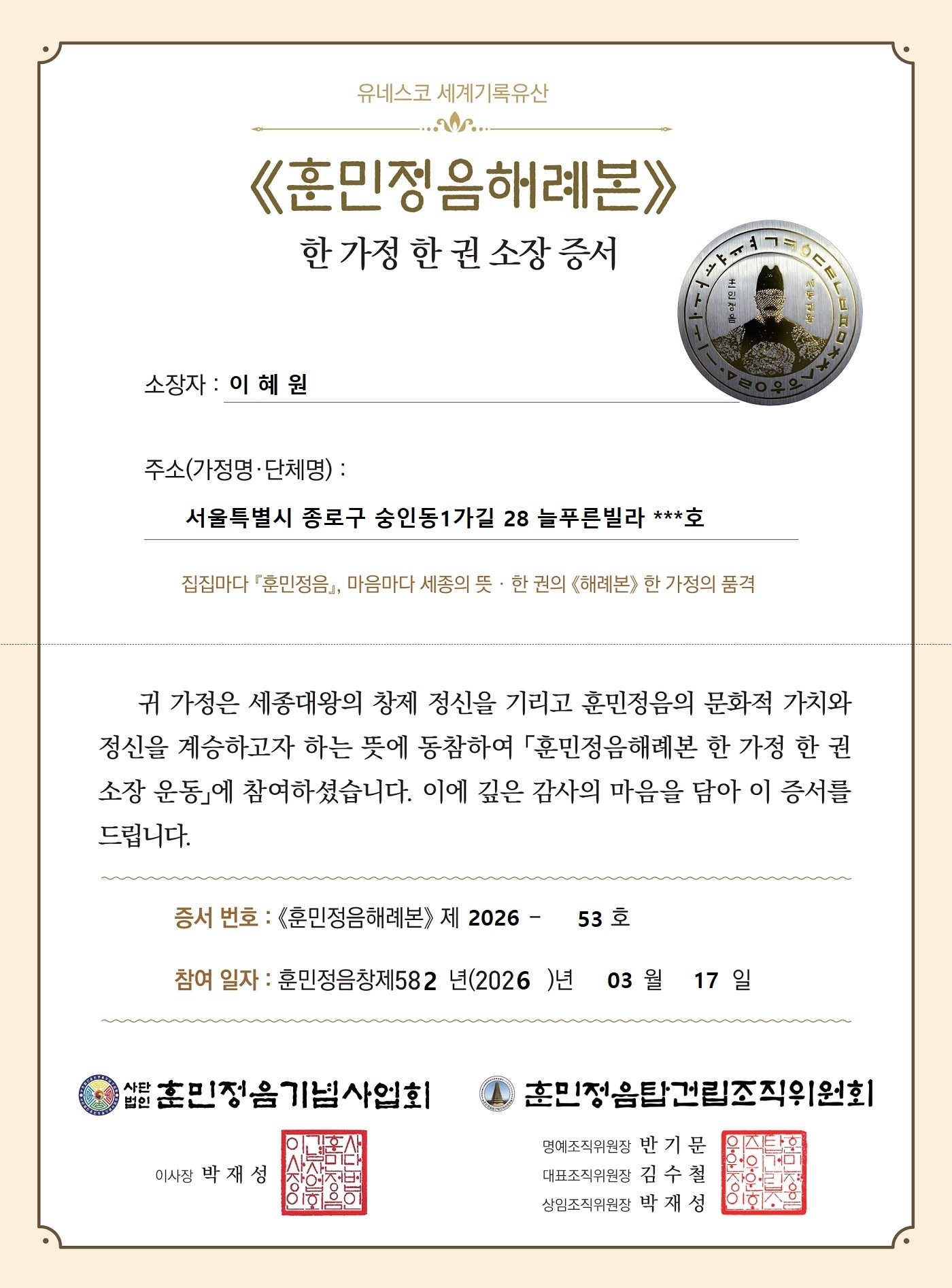 《해례본》 53호 소장자 이혜원 가족
