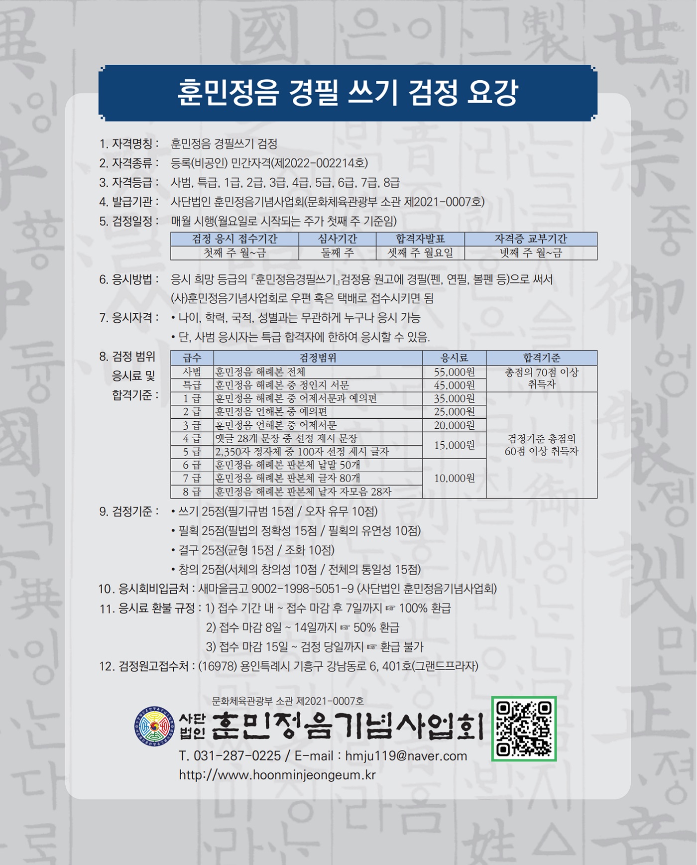 ③『훈민정음 경필쓰기 검정』등급별 응시료는 아래와 같다.