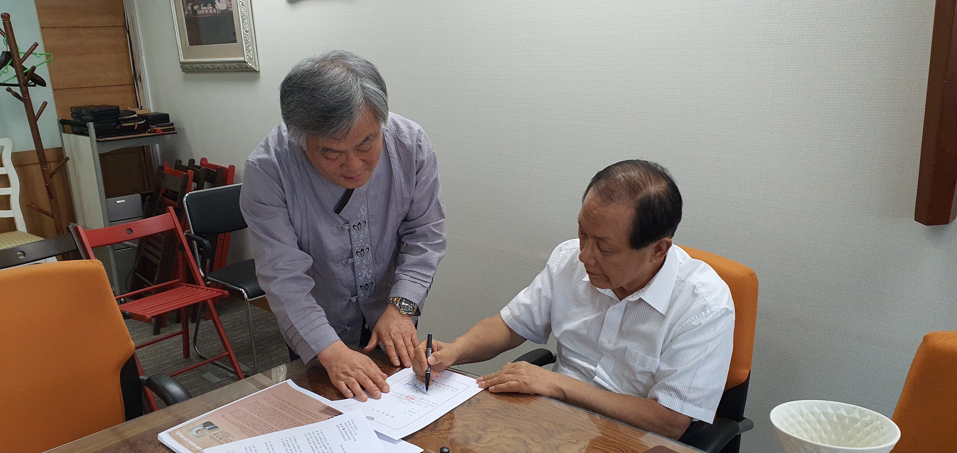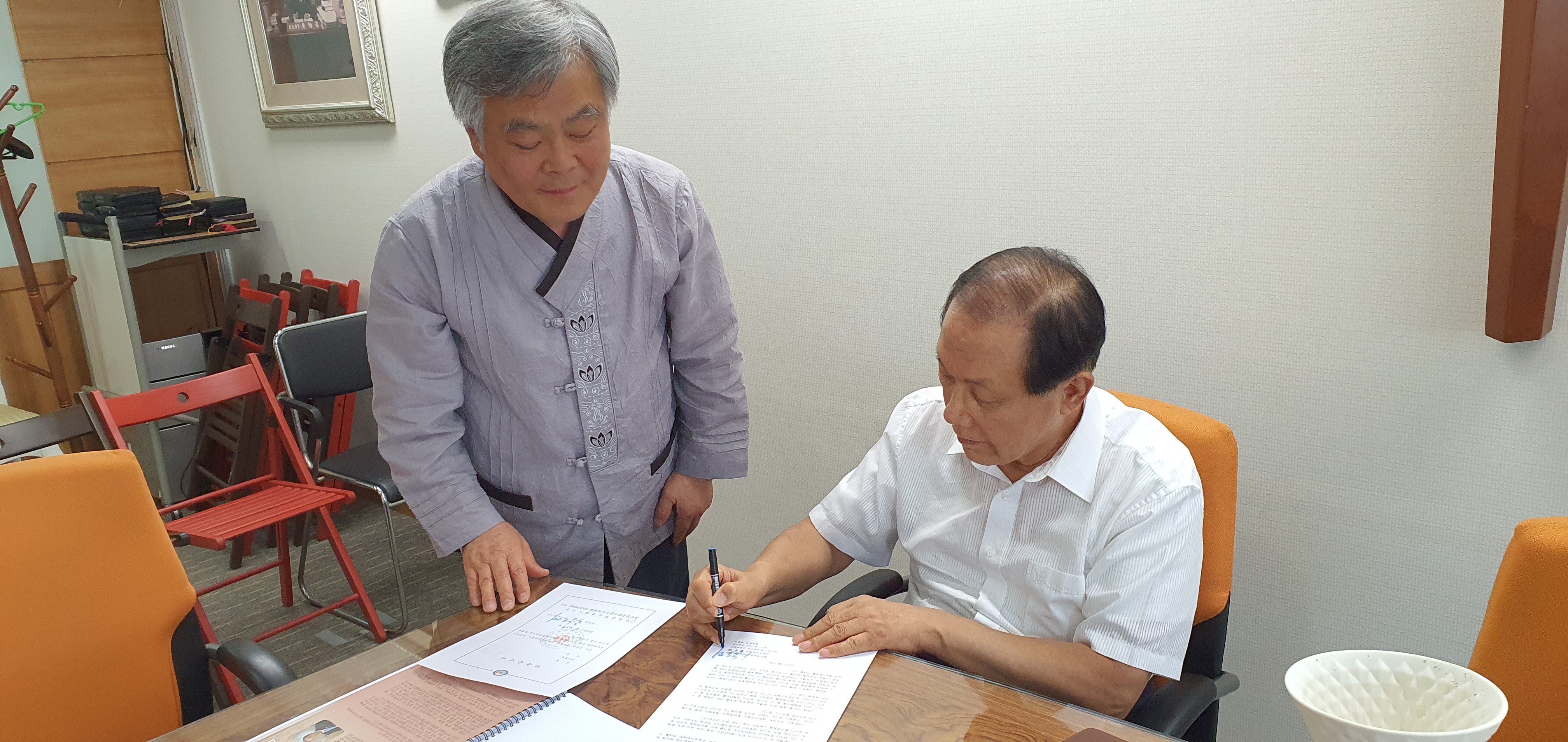 2020년 6월 19일(금) 오후 3시에 사회부총리 겸 교육부장관을 역임하신 황우여 박사님을 예방하여 <훈민정음탑건립조직위원회> 대표조직위원장으로 위촉 수락을 받고 있는 훈민정음탑건립조직위원회 상임조직위원장 박재성 사단법인 한중문자문화교류협회 이사장