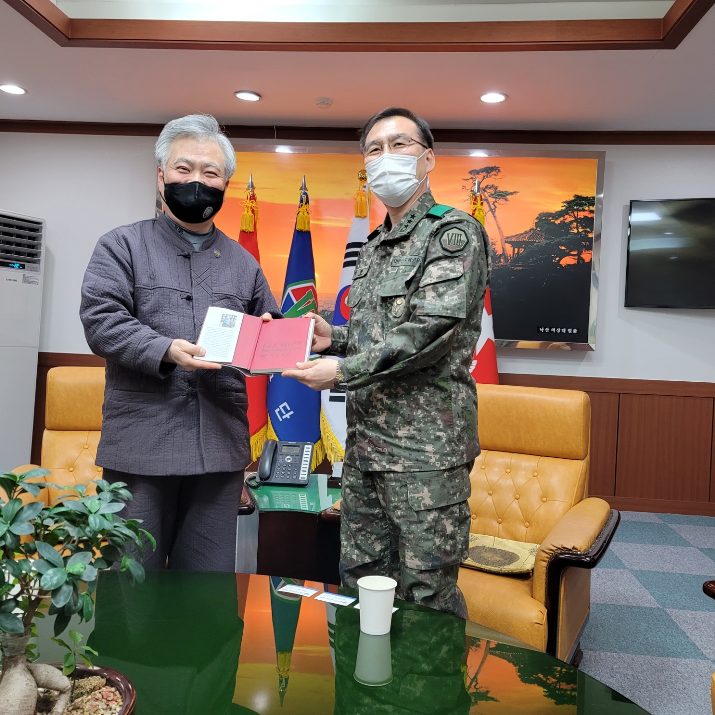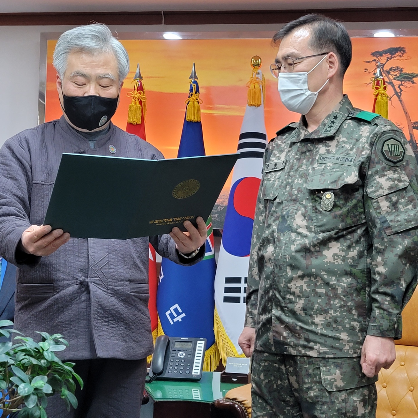 2021년 3월 19일(금) 오후 2시 강원도 양양에 있는 제8군단 사령부에 초대를 받은 사단법인 훈민정음기념사업회 박재성 이사장이 강창구 군단장을 훈민정음탑건립조직위원회 고문 위촉장을 수여하였다.