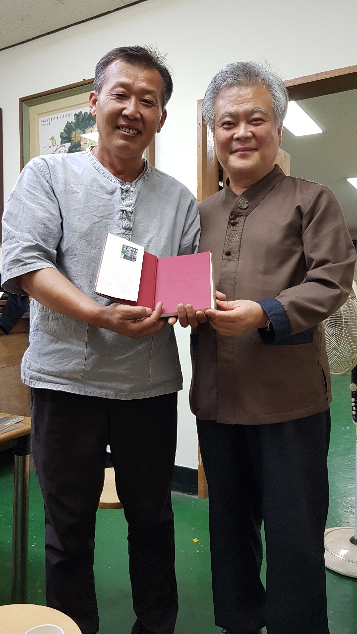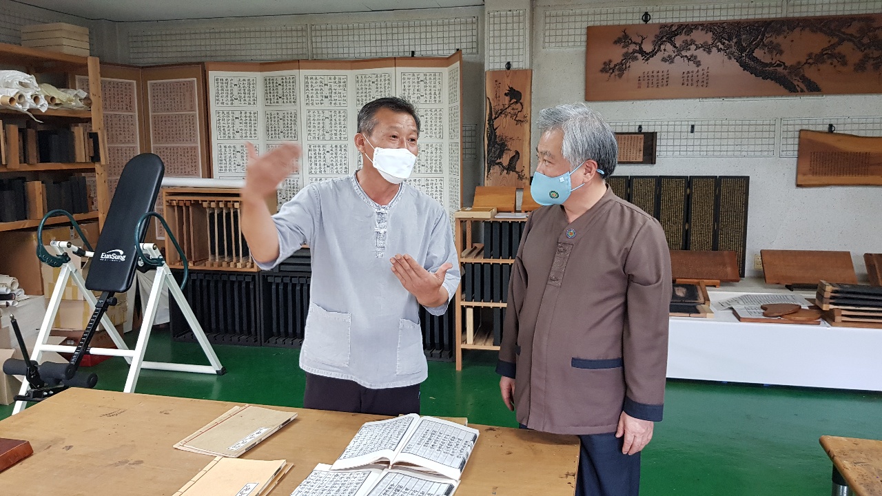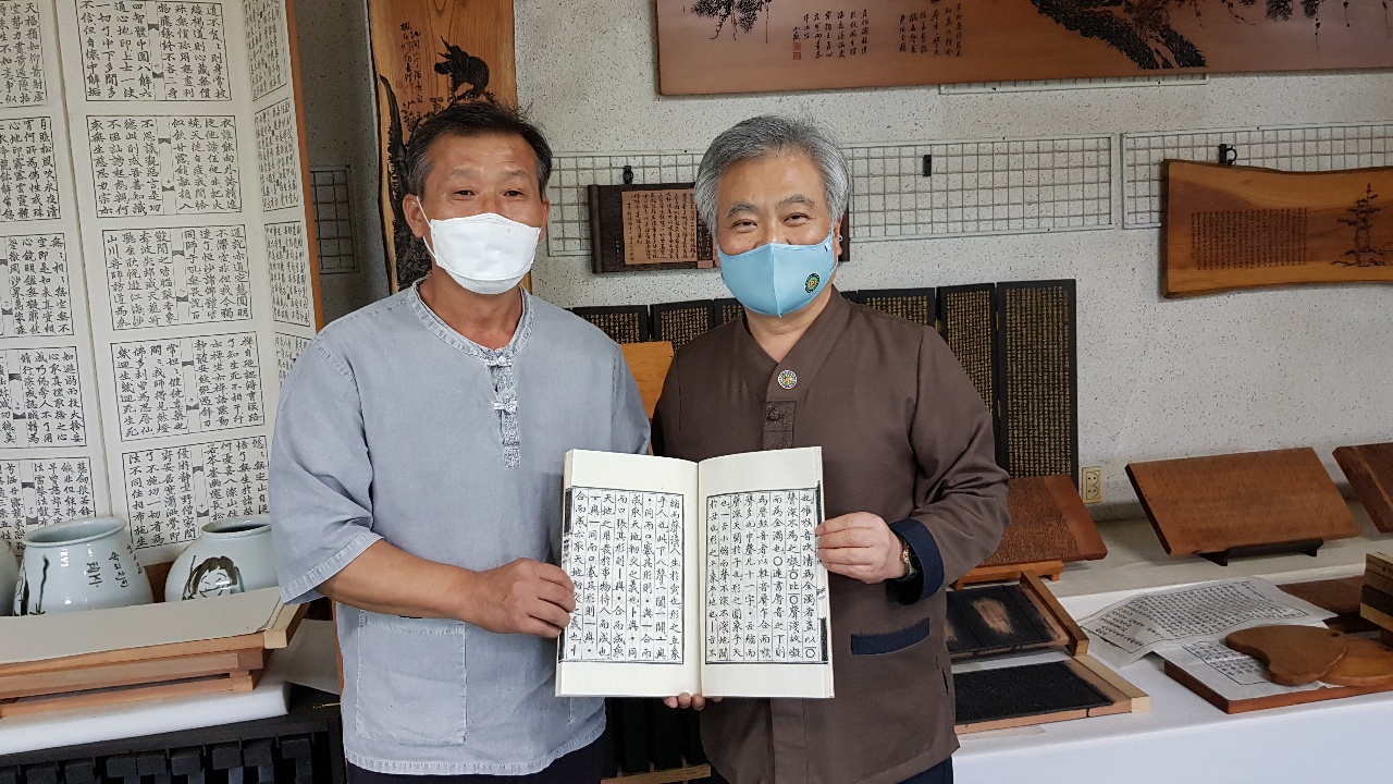 박재성 이사장은 2021년 9월 5일(일) 운곡 김동연 훈민정음기념사업회충북지회장의 안내로 훈민정음해례본을 570년만에 원형대로 재현한 무형문화재 박영덕 각자장 작업실을 방문하고 훈민정음해례본 복각본을 기증받았다.